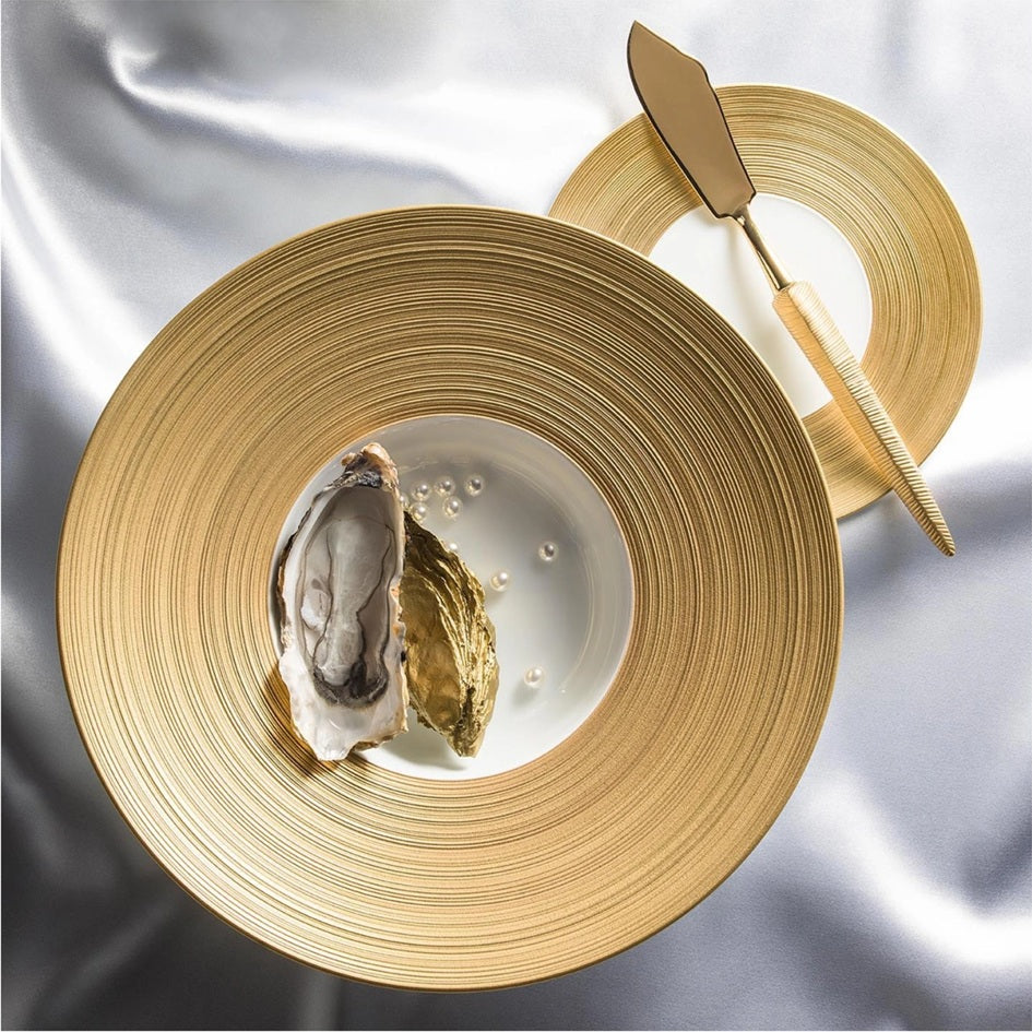 Pensati per valorizzare ogni creazione culinaria con eleganza e si distinguono per il raffinato decoro concentrico in oro che impreziosisce il bordo, donando un delicato contrasto e mettendo in risalto l’impiattamento.
