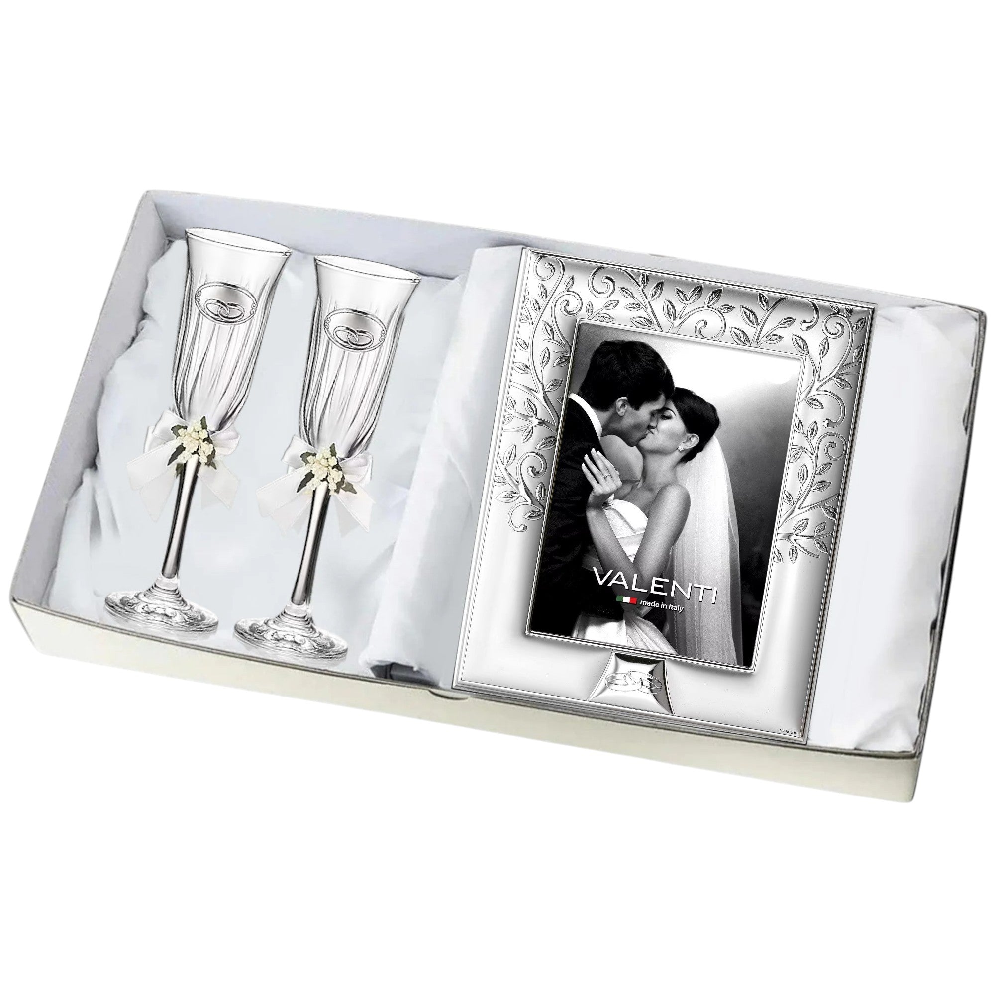 Set Cornice Portafoto Nozze+Coppia di flûte della collezione di Valenti, con cornice realizzata in argento mirò silver e coppia di flute in cristallo con dettagli in argento.
