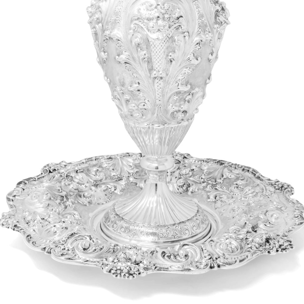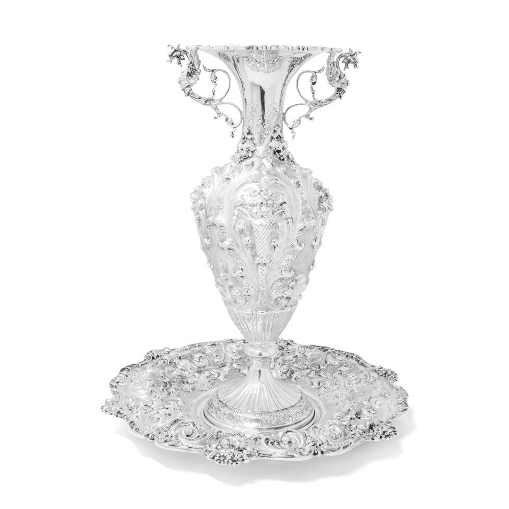 Anfora con Piatto della collezione Prestigio Argenti, realizzata in Argento 800 con decoro cesellato a sbalzo con manici in fusione.