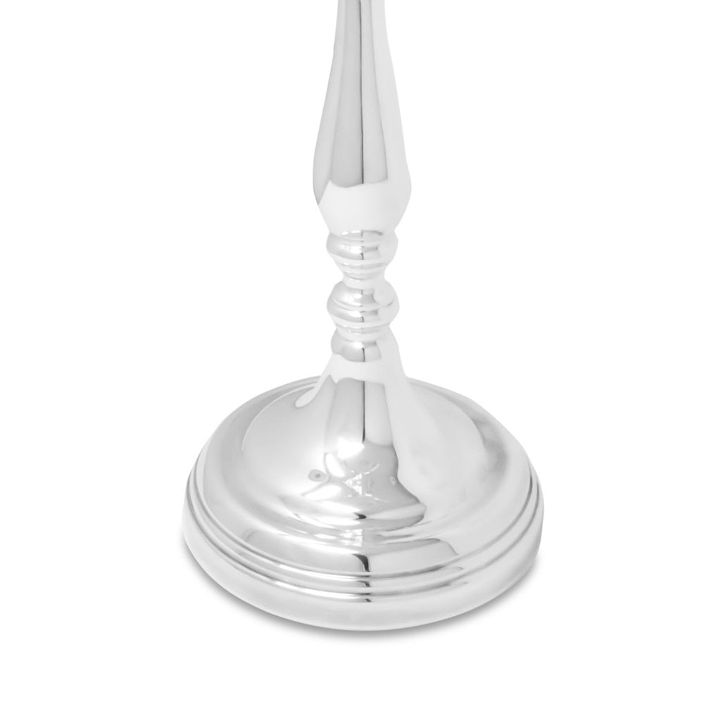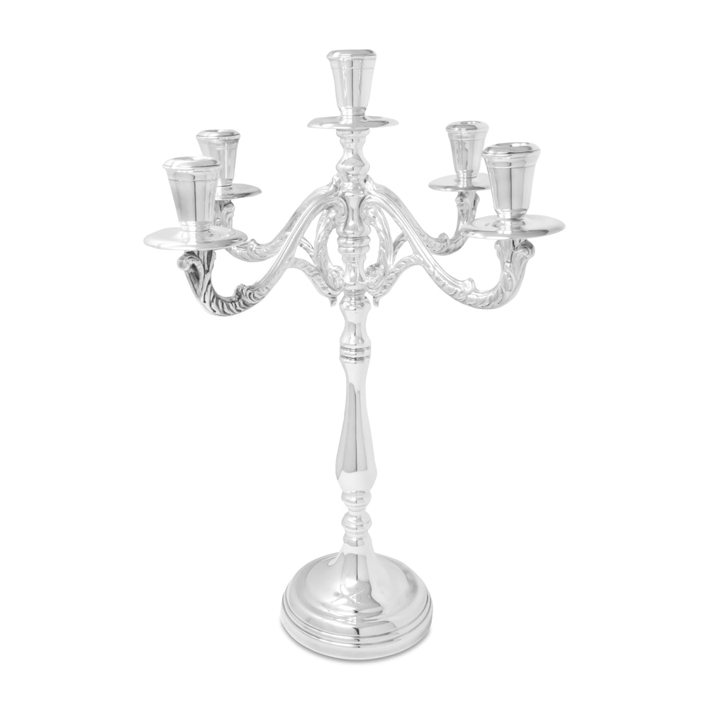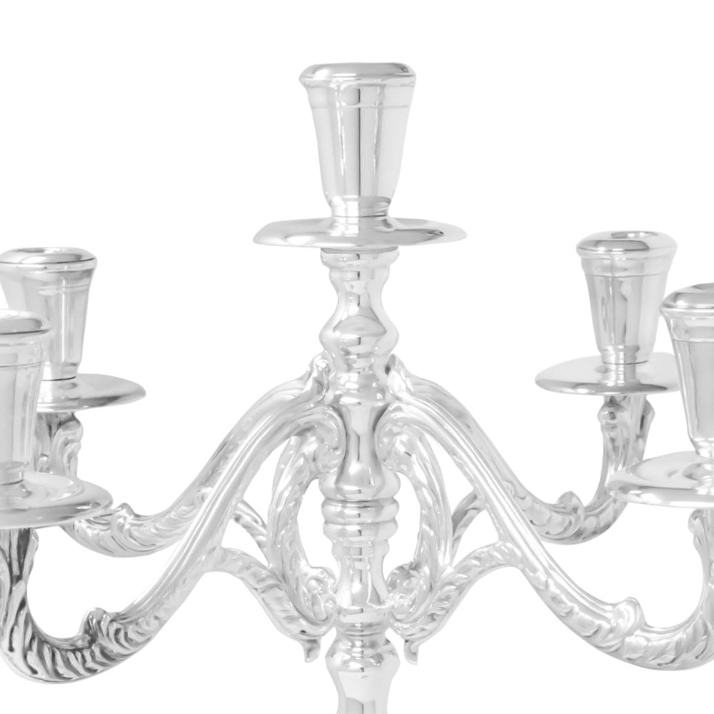 Candeliere a 5 Fiamme della collezione Prestigio Argenti, realizzato in Argento 800 con base in stile inglese e parte alta con decoroin stile barocco.