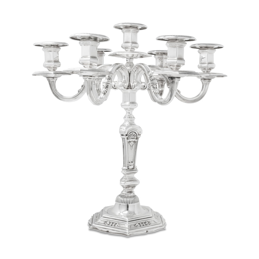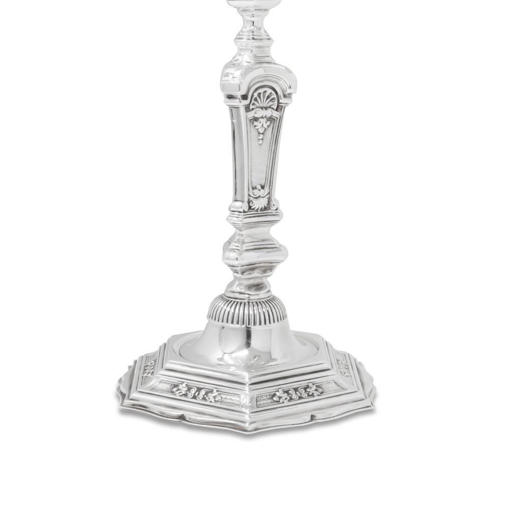 Candeliere a 7 Fiamme della collezione Prestigio Argenti, realizzato in Argento 800 con decoroin stile barocco e base esagonale.