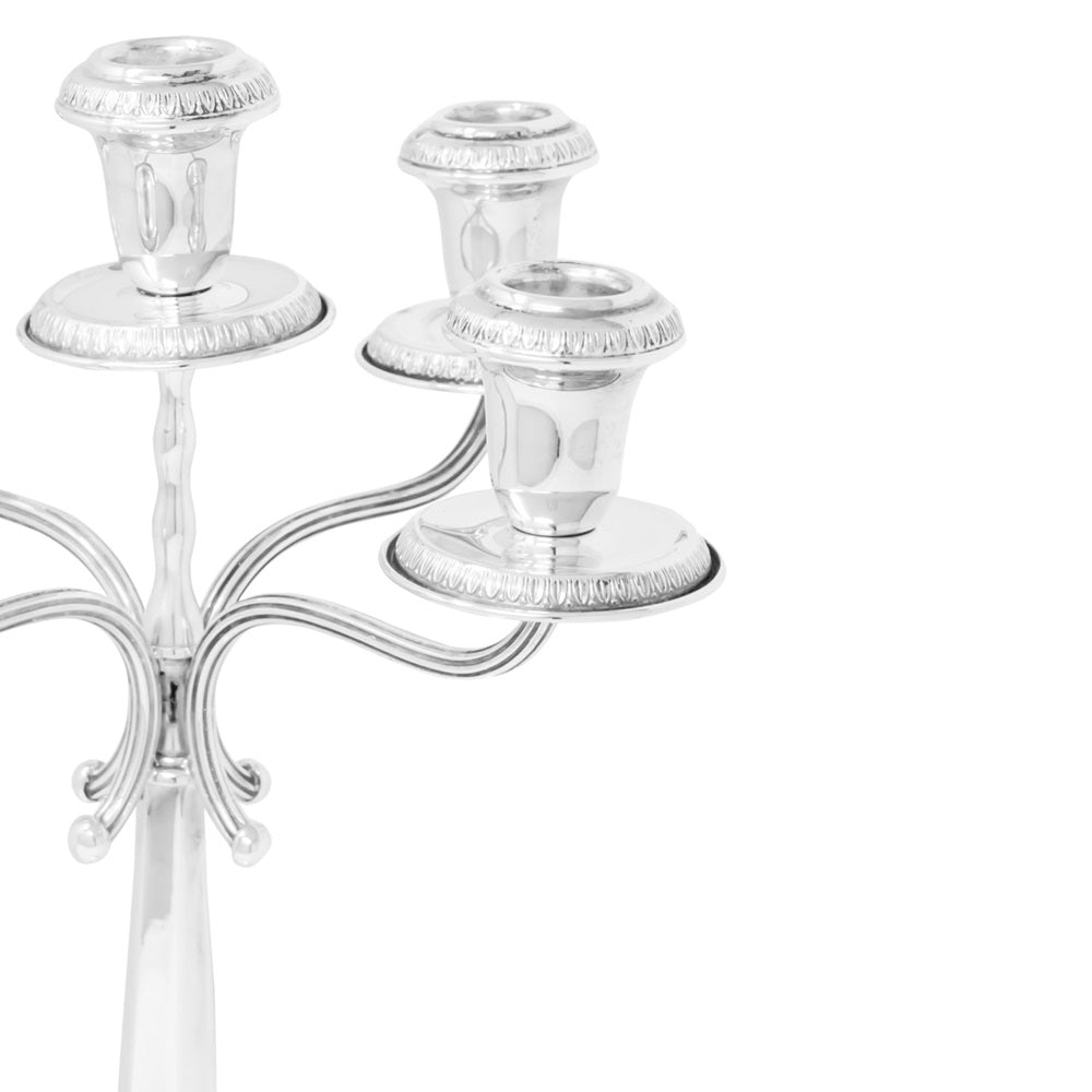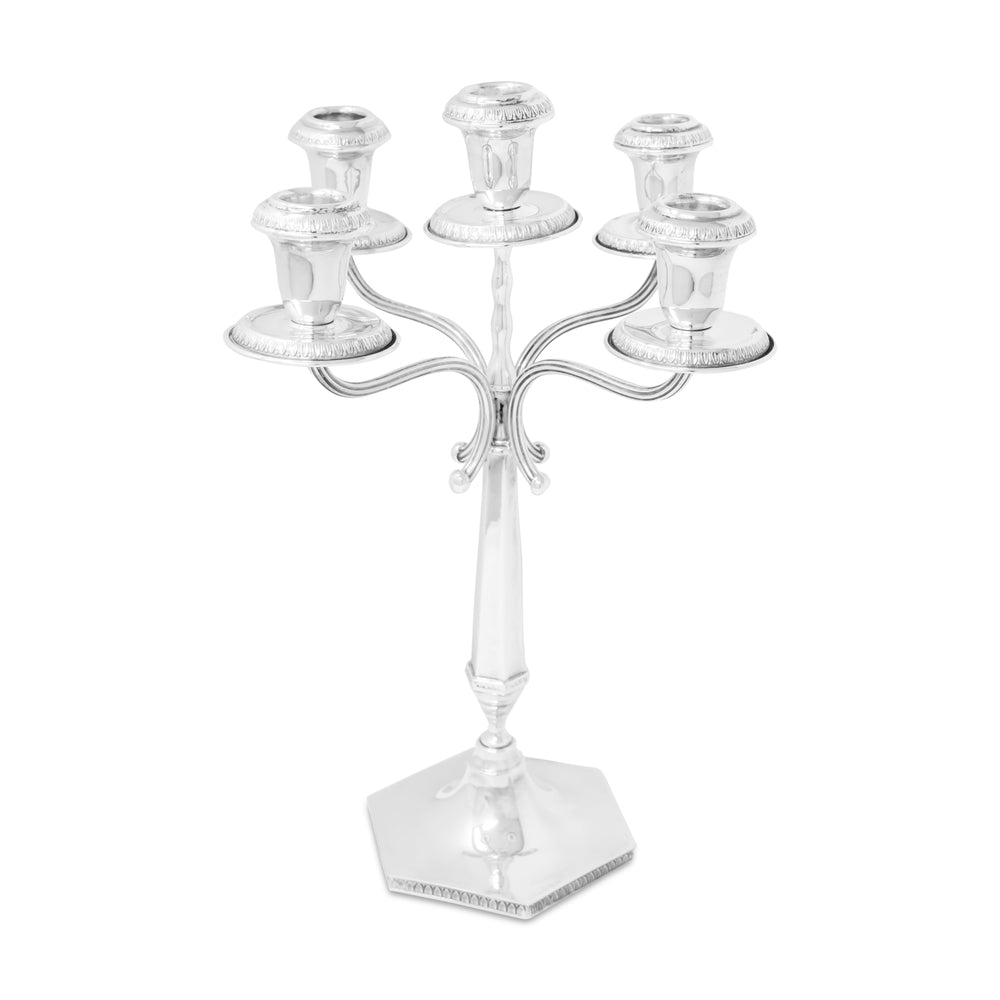 Candeliere a 5 Fiamme della collezione Prestigio Argenti, realizzato in Argento 800 con decoroin stile impero e base esagonale.