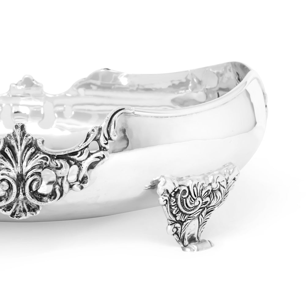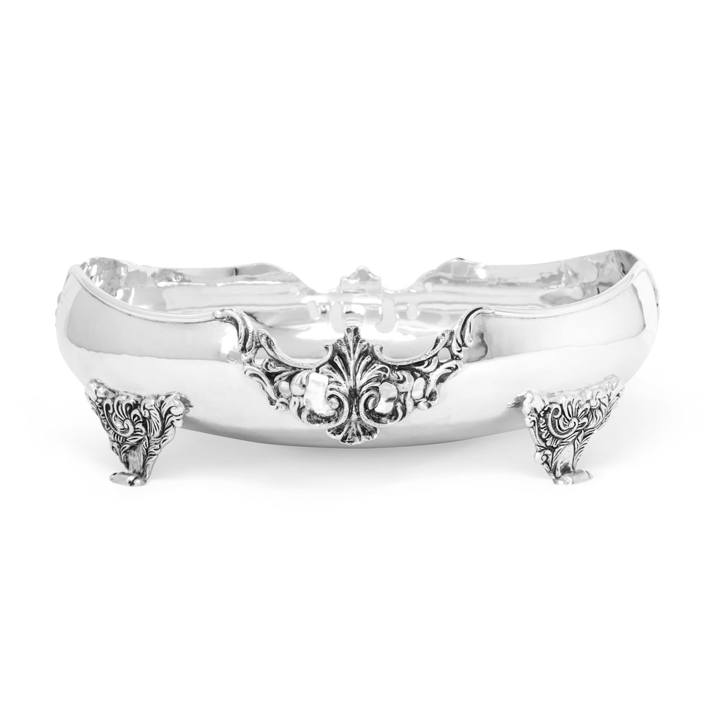 Centrotavola della collezione Prestigio Argenti, realizzato in Argento 800 con decoro liscio, bordo smerlato e piedini in fusione.