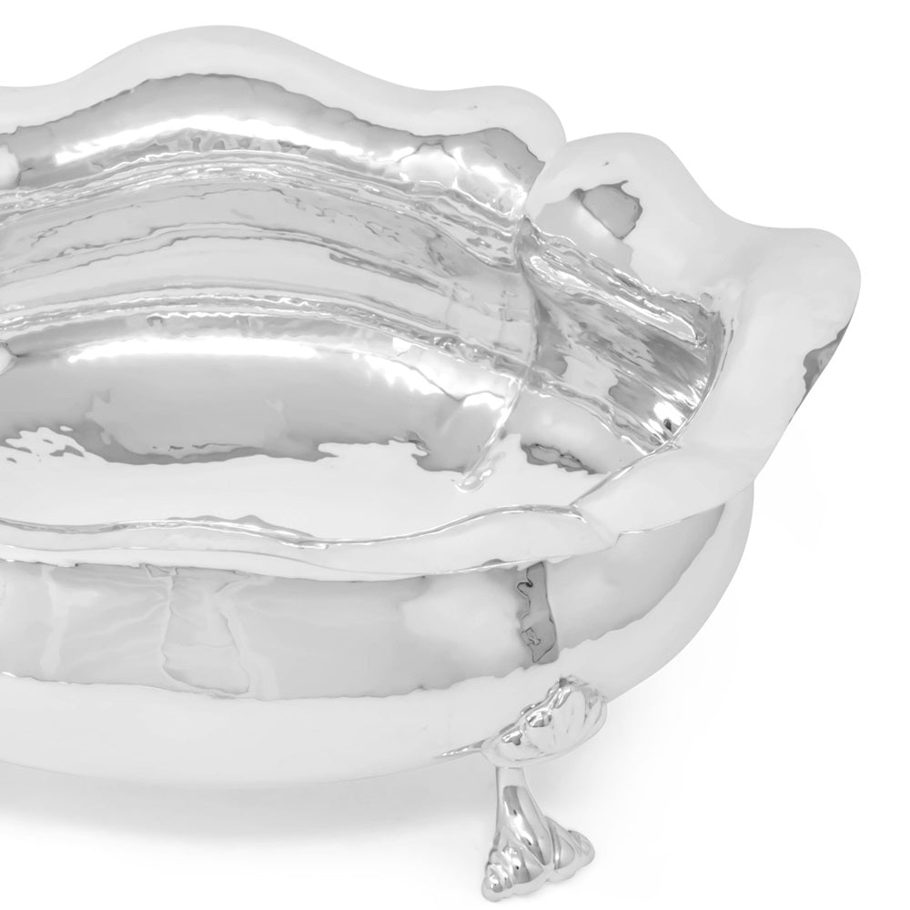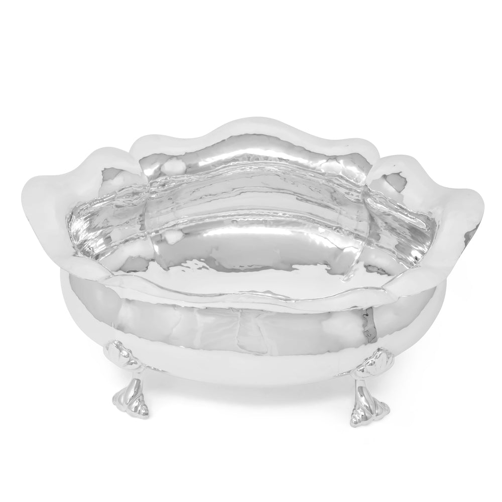 Centrotavola della collezione Prestigio Argenti, realizzato in Argento 800 con finitura liscia, bordo smerlato e piedini in fusione.