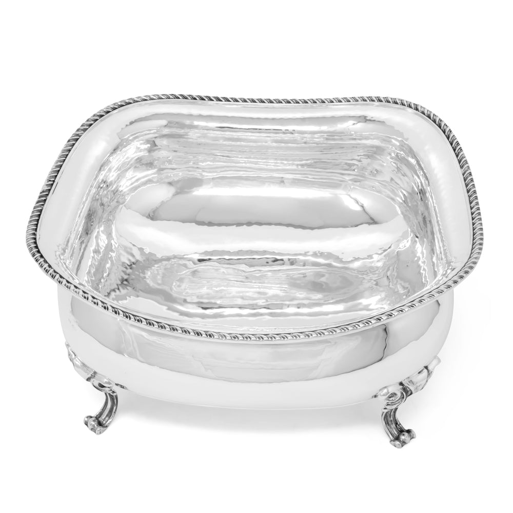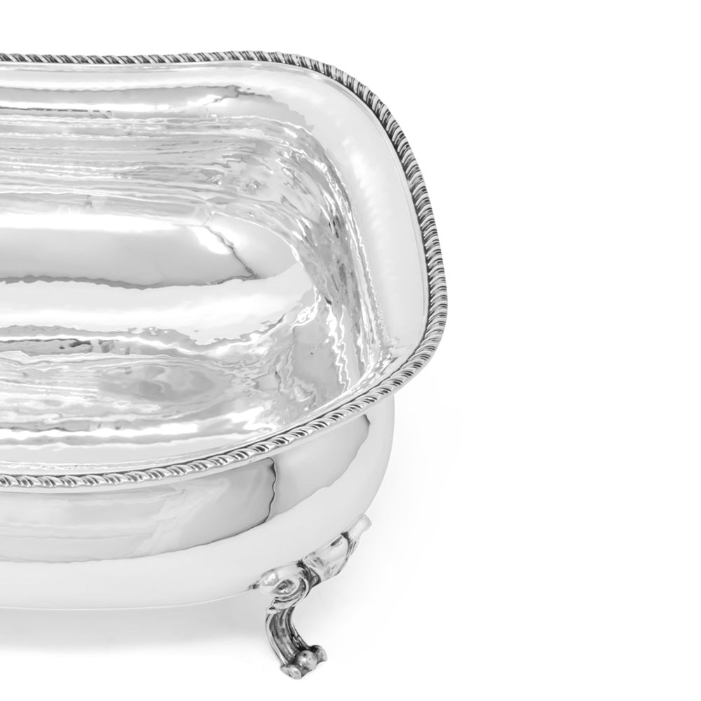 Centrotavola della collezione Prestigio Argenti, realizzato in Argento 800 con finitura liscia, bordo con decoro Regina Anna e piedini in fusione.