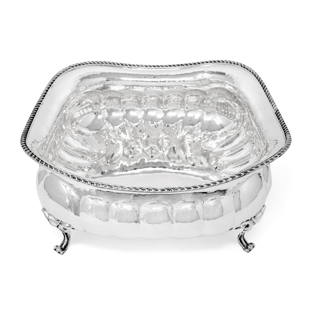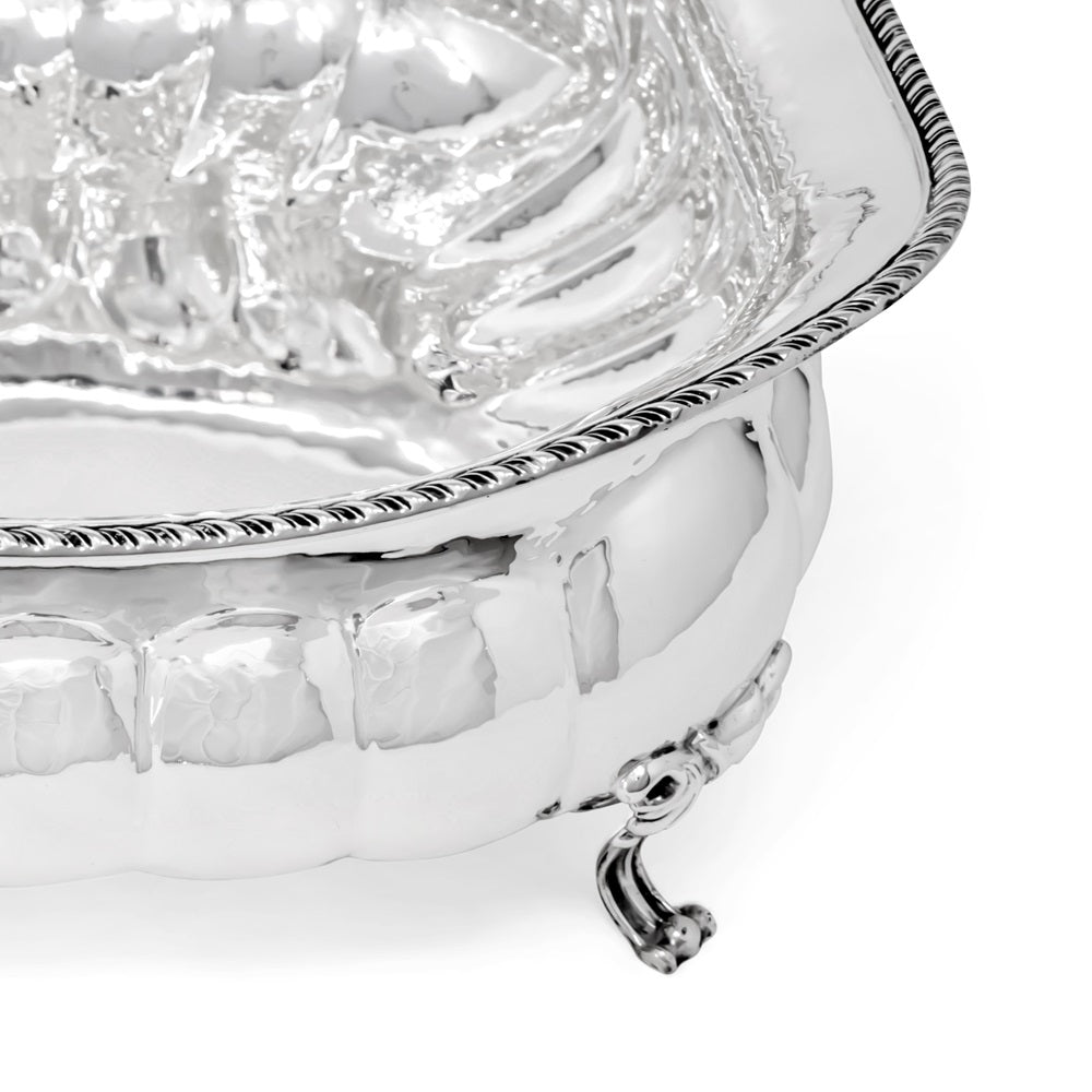 Centrotavola della collezione Prestigio Argenti, realizzato in Argento 800 con finitura liscia, bordo decoro Regina Anna e con piedini in fusione.