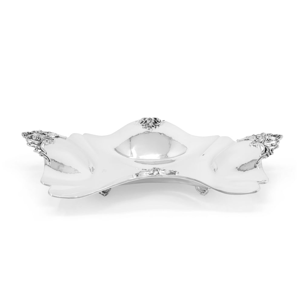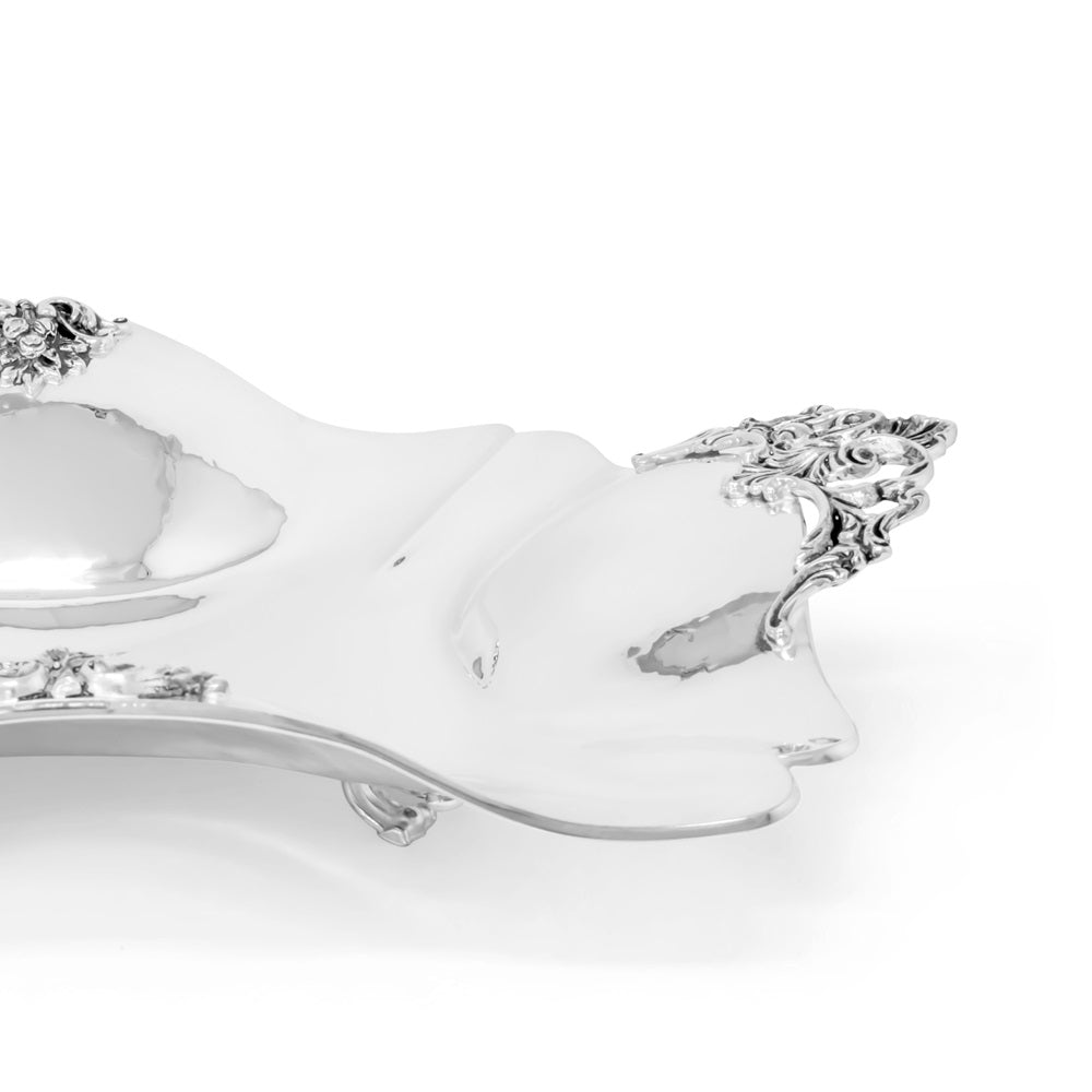 Centrotavola della collezione Prestigio Argenti, realizzato in Argento 800 con decoro liscio e con applicazioni, manici e piedini in fusione.