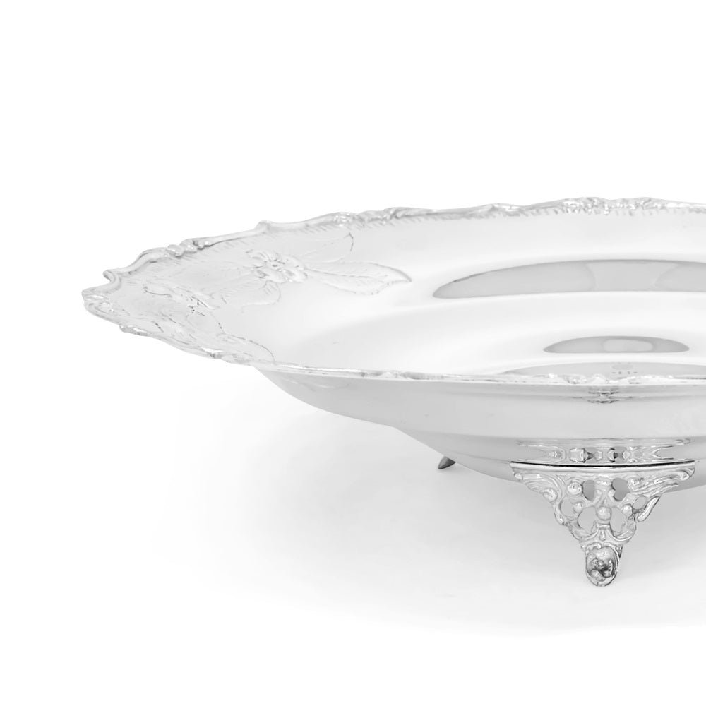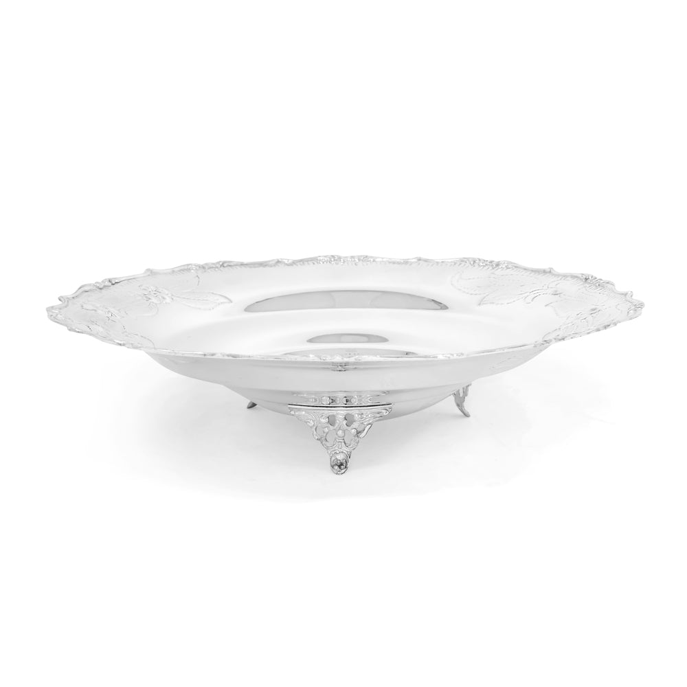 Cestello con piedini della collezione Prestigio Argenti, realizzato in Argento 800 con decoro cesellato floreale a sbalzo e bordo smerlato.