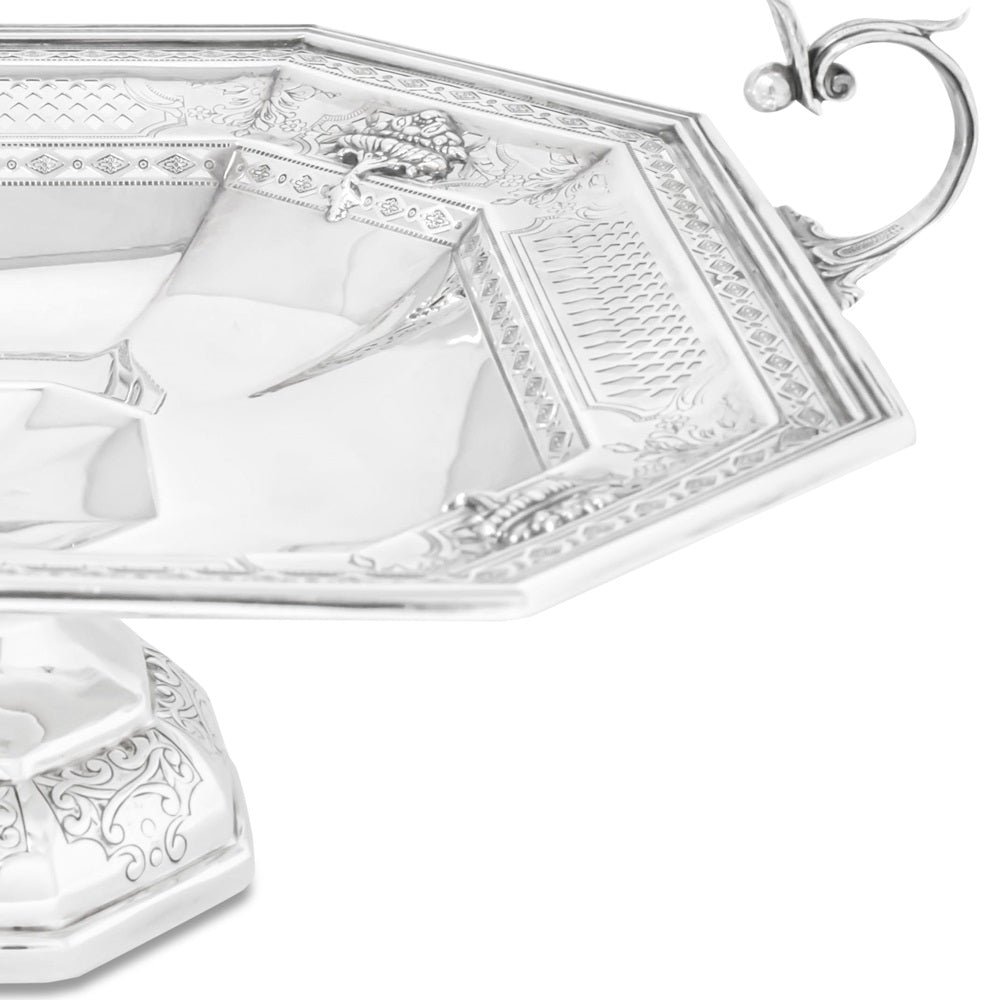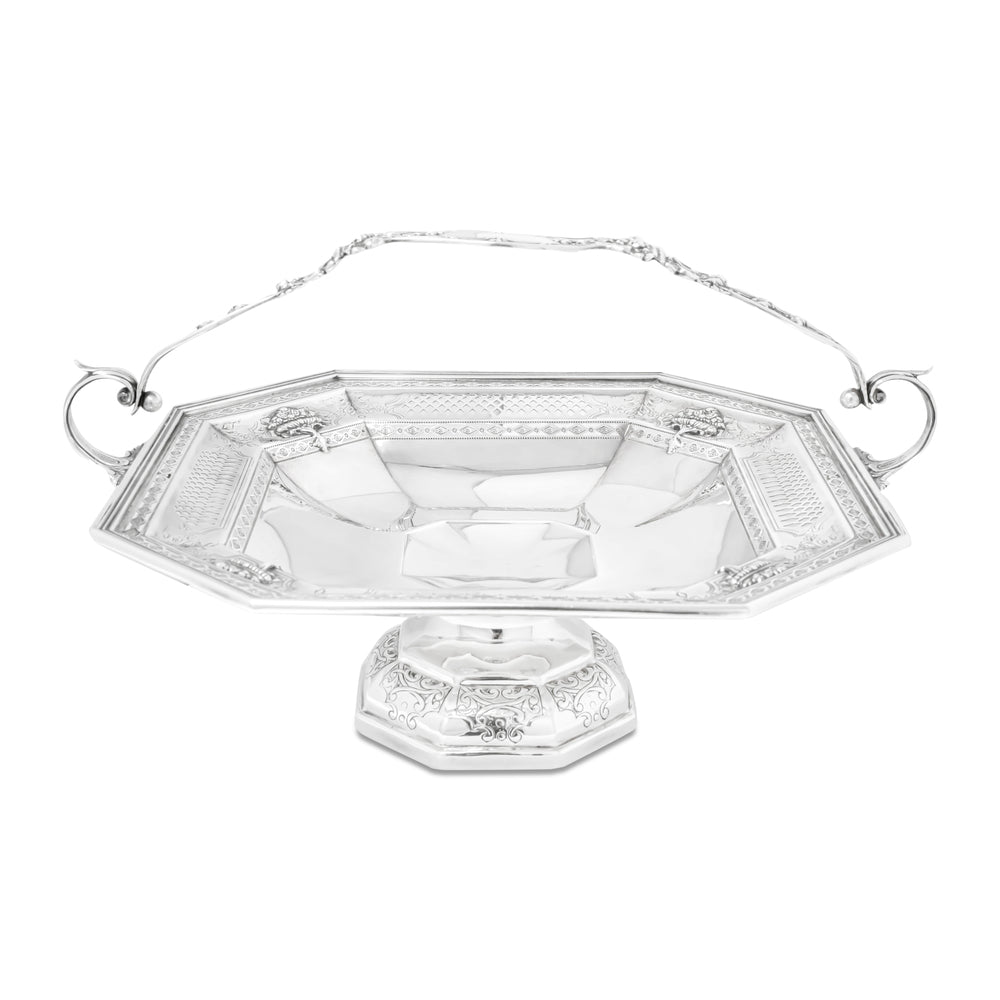 Cestino della collezione Prestigio Argenti, realizzato in Argento 925%, con decoro barocco cesellato, manico in fusione e bordo traforato.