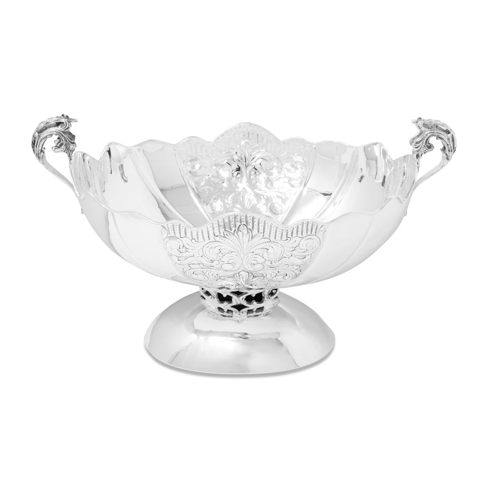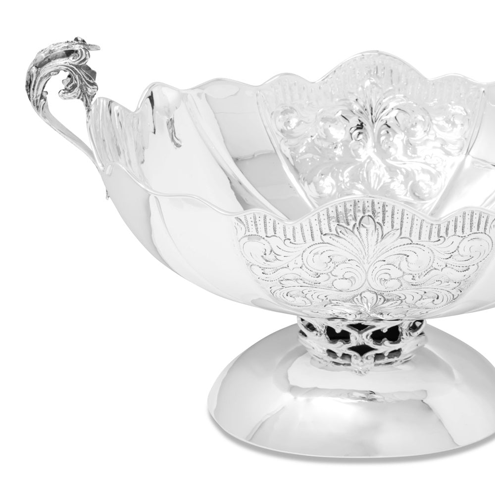 Jatte della collezione Prestigio Argenti, realizzata in Argento 800, con decoro cesellato sbalzato con manici in fusione e supporto della base traforato.
