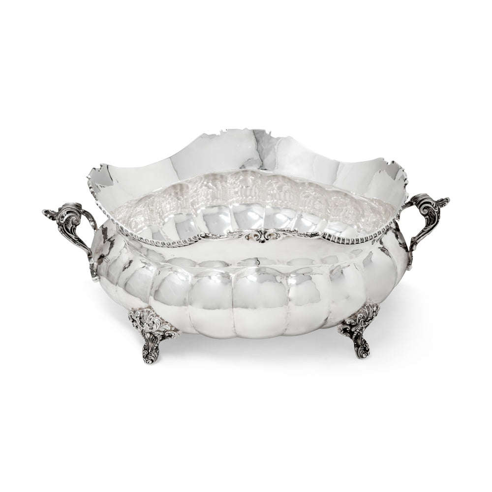 Jatte della collezione Prestigio Argenti, realizzata in Argento 800 con decoro Regina Anna con manici e piedini in fusione.