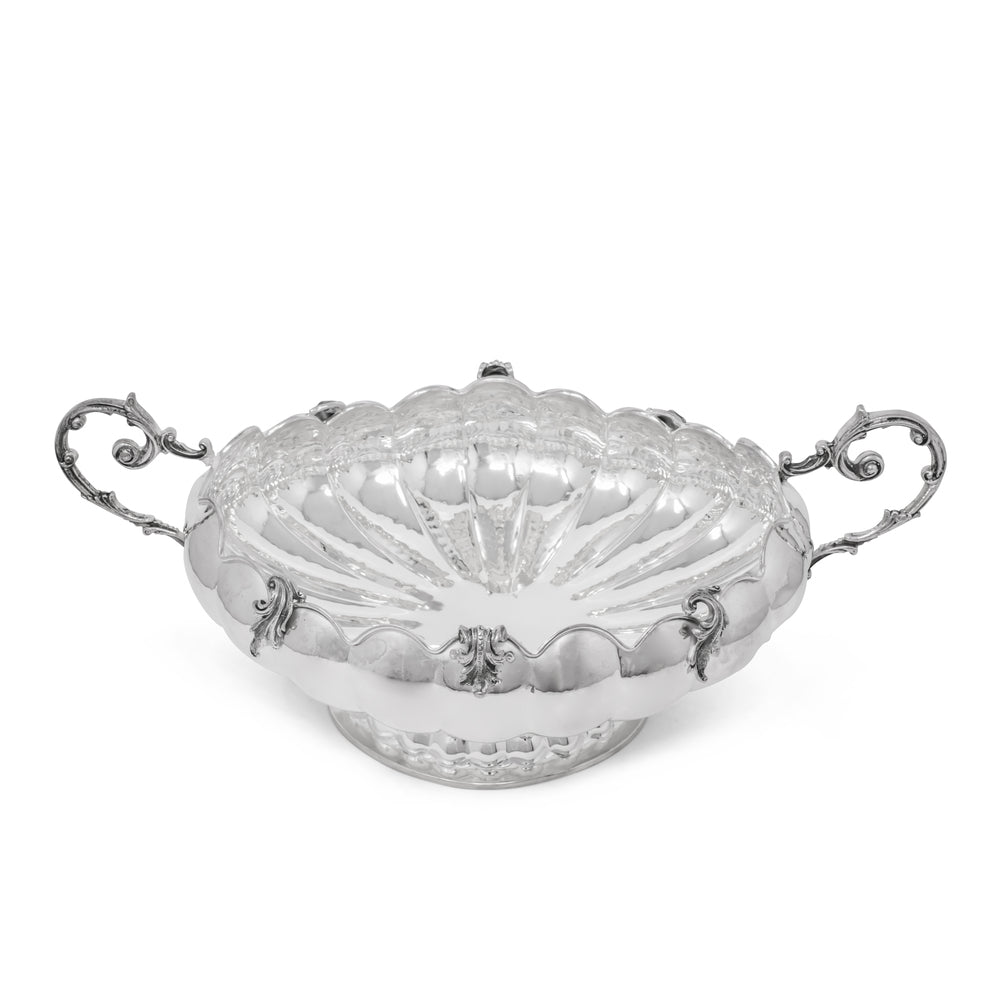 Jatte della collezione Prestigio Argenti, realizzata in Argento 800 con decoro rigato, bordo smerlato con applicazioni e manici in fusione.