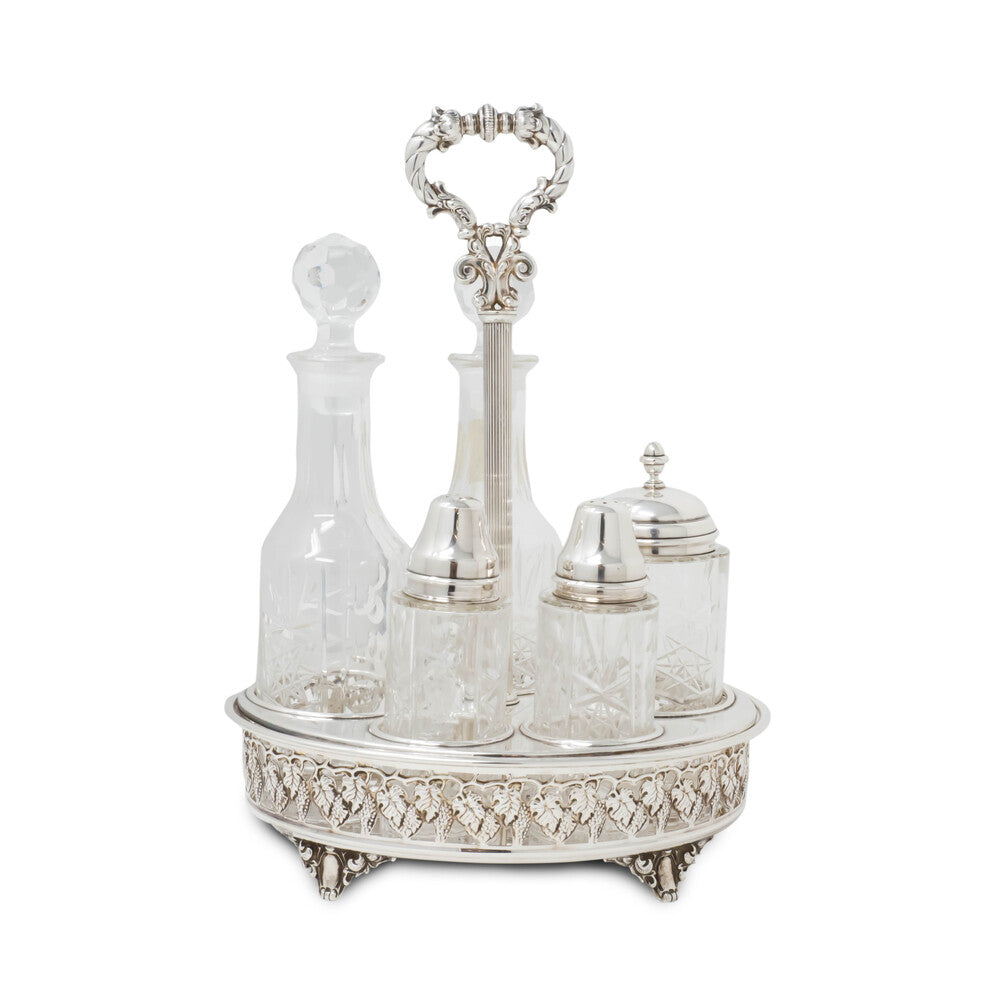 Menage della collezione Prestigio Argenti, realizzato in Argento 800 con decorazione traforata, composto da: Oliera, Acetiera, Saliera e Pepiera.