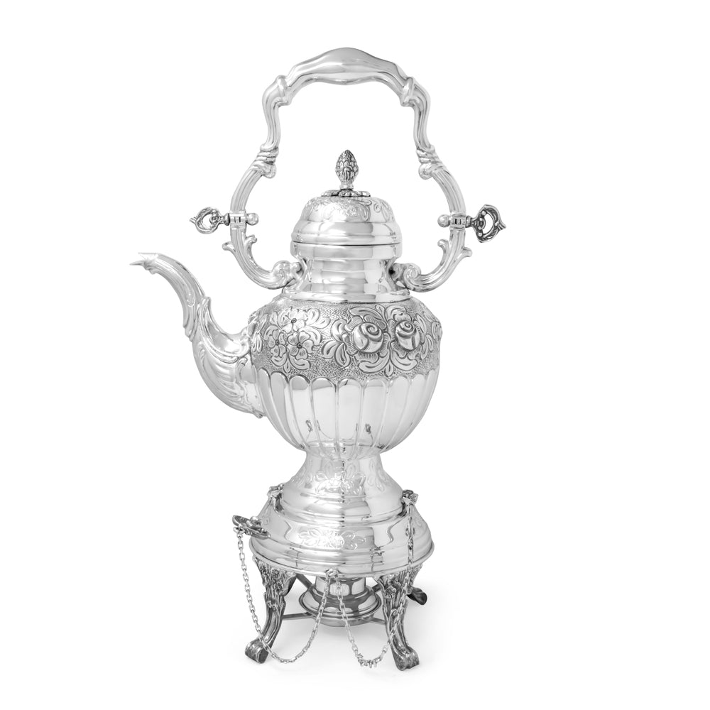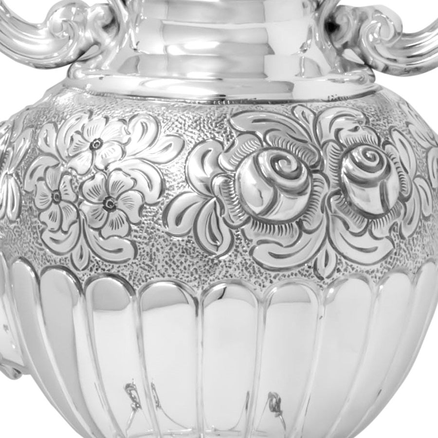 Samovar della collezione Prestigio Argenti, realizzato in Argento 800 con decoro in stile barocco con rose sbalzate.