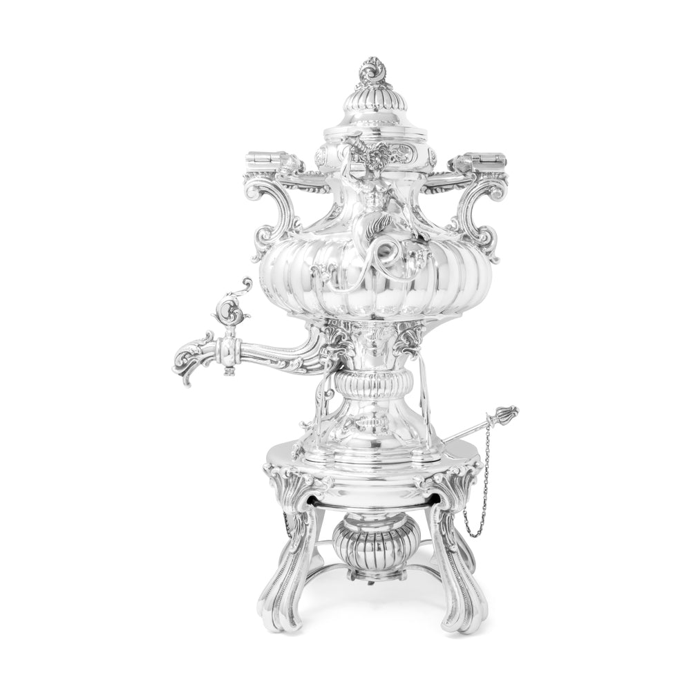 Samovar della collezione Prestigio Argenti, realizzato in Argento 800 con decoro in stile barocco con applicazioni in fusione.