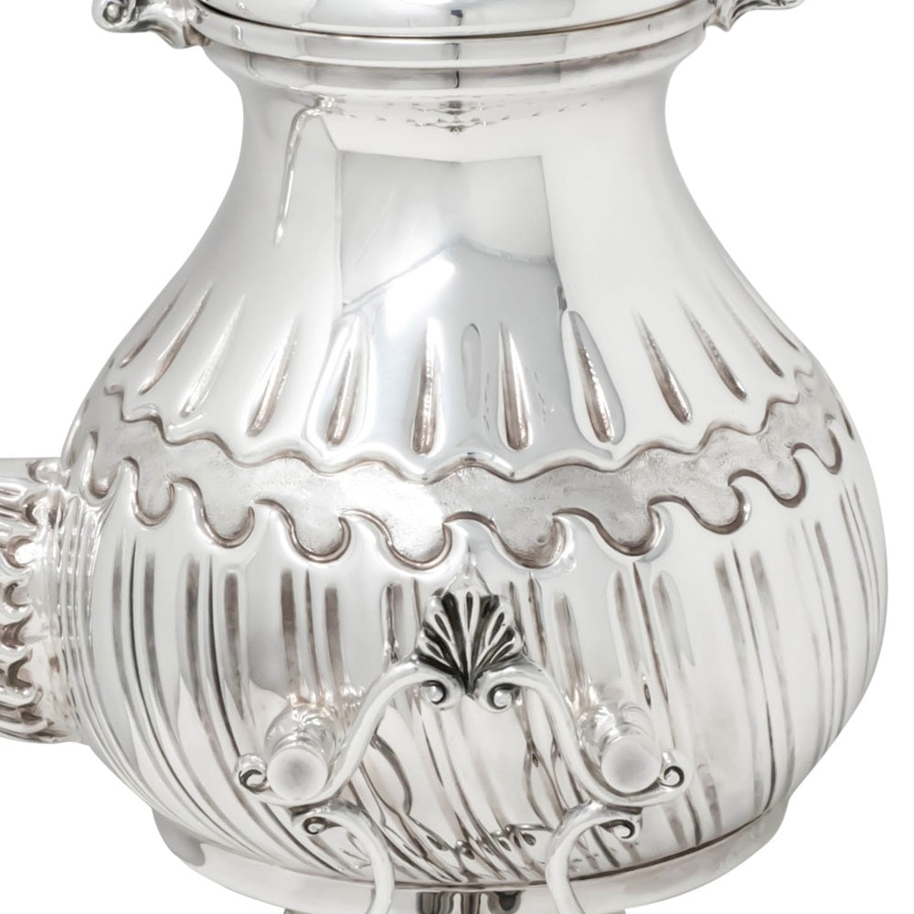 Samovar della collezione Prestigio Argenti, realizzato in Argento 800 con decoro rigato con manici in legno.