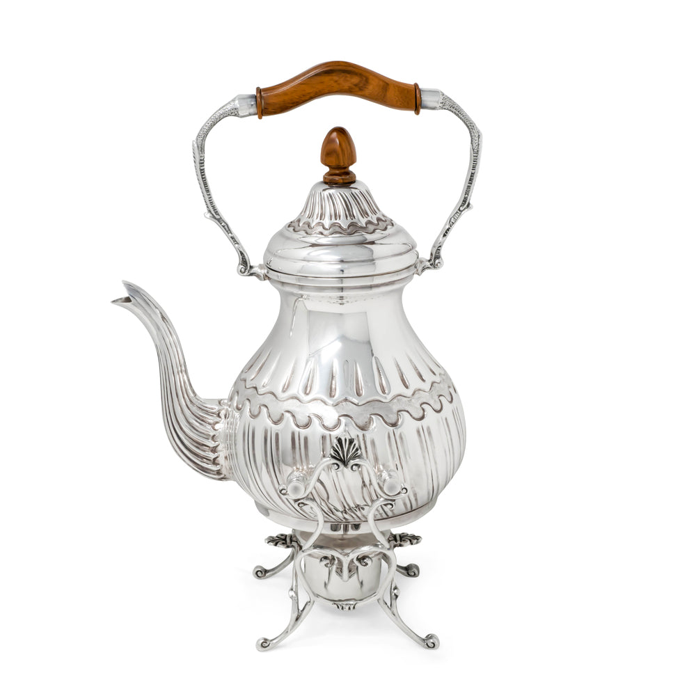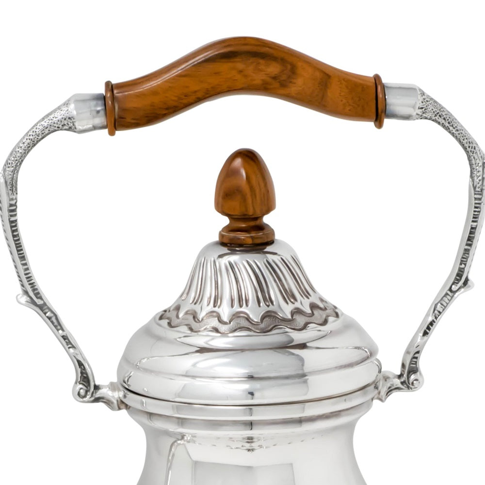 Samovar della collezione Prestigio Argenti, realizzato in Argento 800 con decoro rigato con manici in legno..