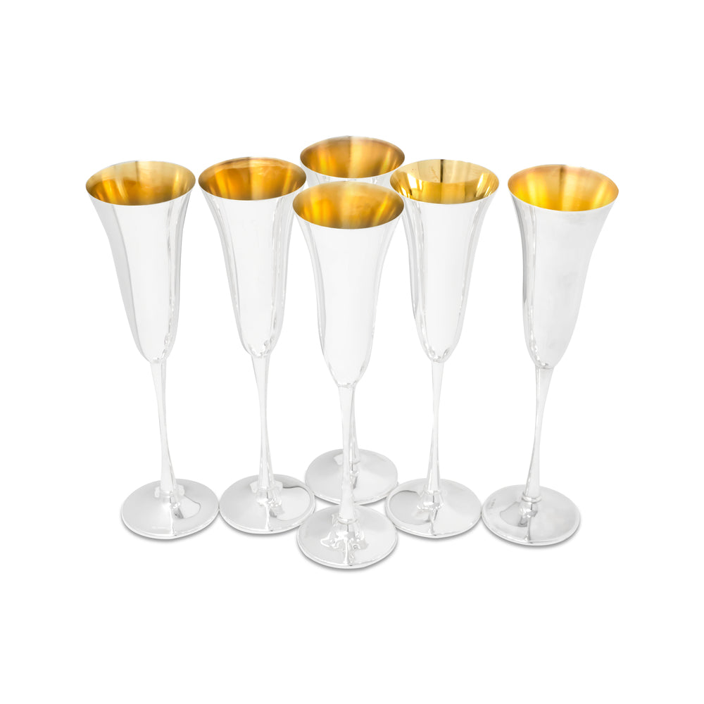 Set 6 Flûte della collezione Prestigio Argenti, realizzate in Argento 800, con decorazione liscia e interno dorato.