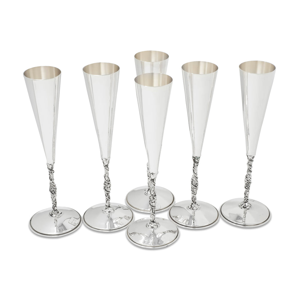 Set 6 Flûte della collezione Prestigio Argenti, realizzate in Argento 800, con decorazione liscia e interno dorato.