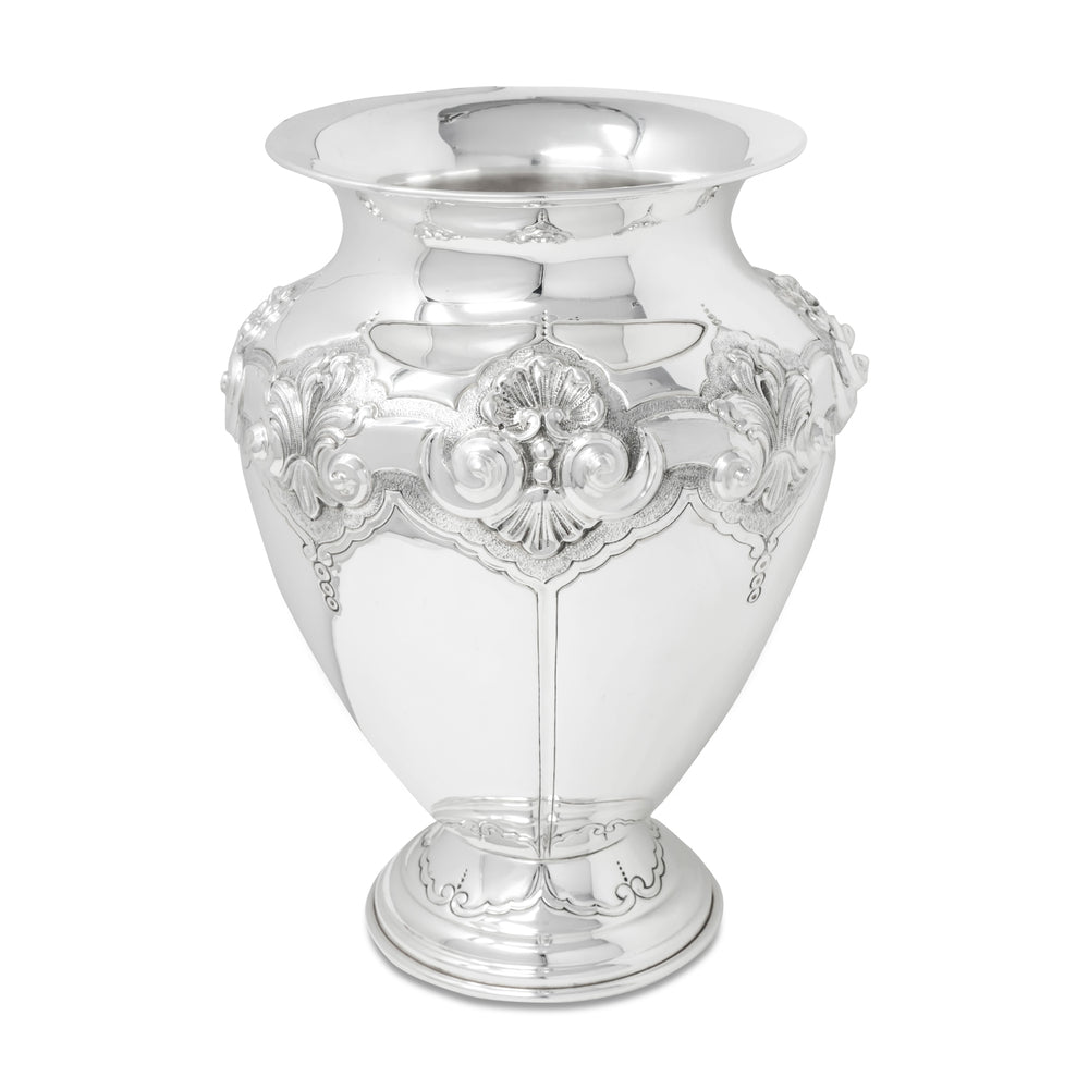 Vaso della collezione Prestigio Argenti, realizzato in Argento 800 con decorobarocco cesellato.