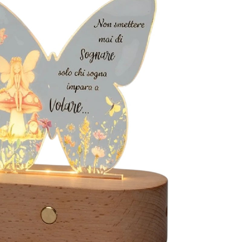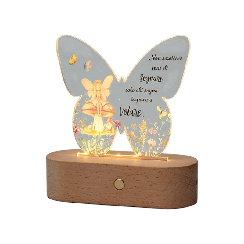 Lampada led Fatina e Funghetto della collezione Sogni di Luce AD, realizzata in plexiglass con base luminosa, un oggetto dal design delicato e simbolico, capace di creare un’atmosfera calda e suggestiva.