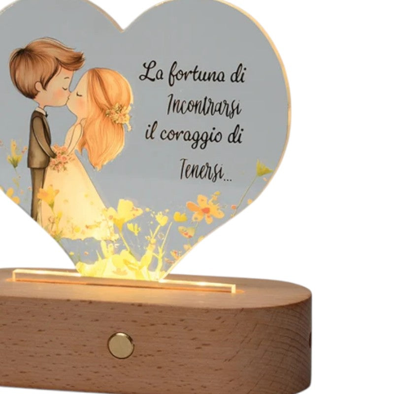 Lampada led Sposini della collezione Sogni di Luce AD, realizzata in plexiglass con base luminosa, un oggetto dal design delicato e simbolico, capace di creare un’atmosfera calda e suggestiva.