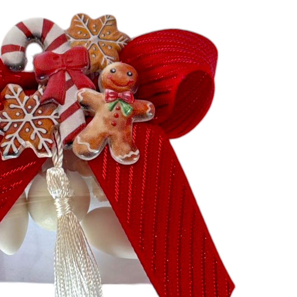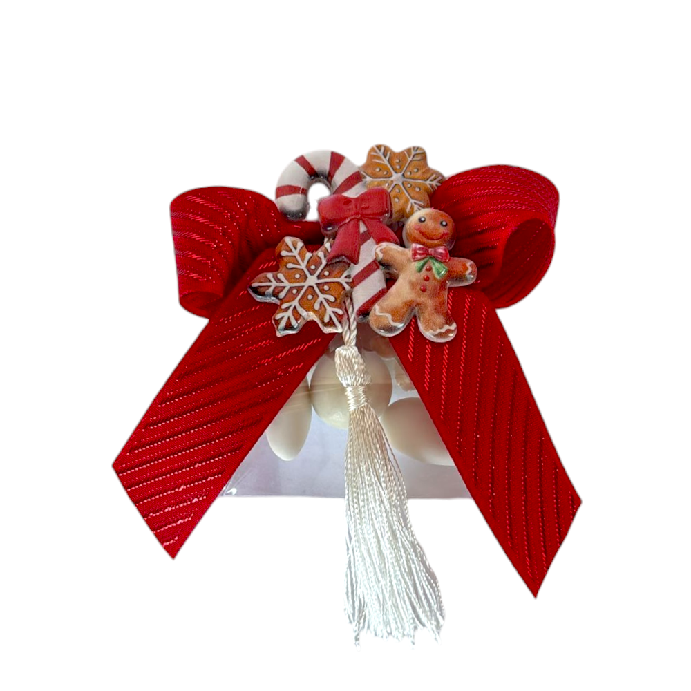 Bomboniera con fiocco glitterato, calamita candy e nappa pendente per un tocco brillante e originale.
