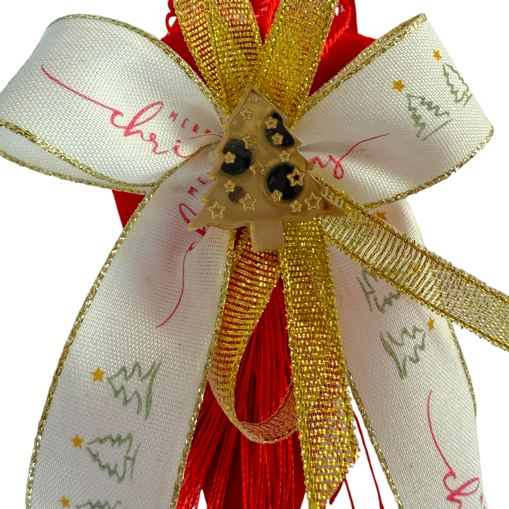 Bomboniera con cono in velluto, con doppio fiocco in tessuto e alberello in plexiglass.