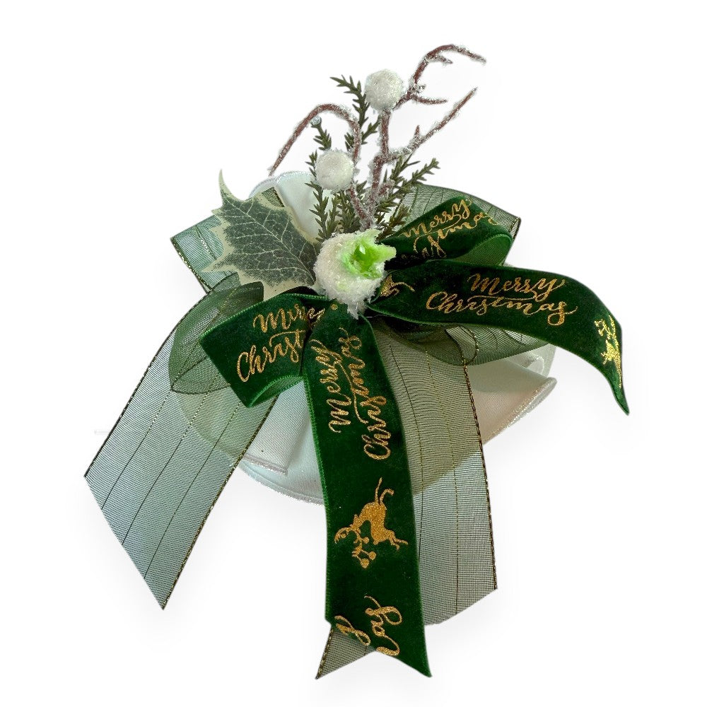 Bomboniera pouf con sacchetto in raso, decorata con doppio fiocco in velluto e organza, arricchiti da dettagli natalizi.