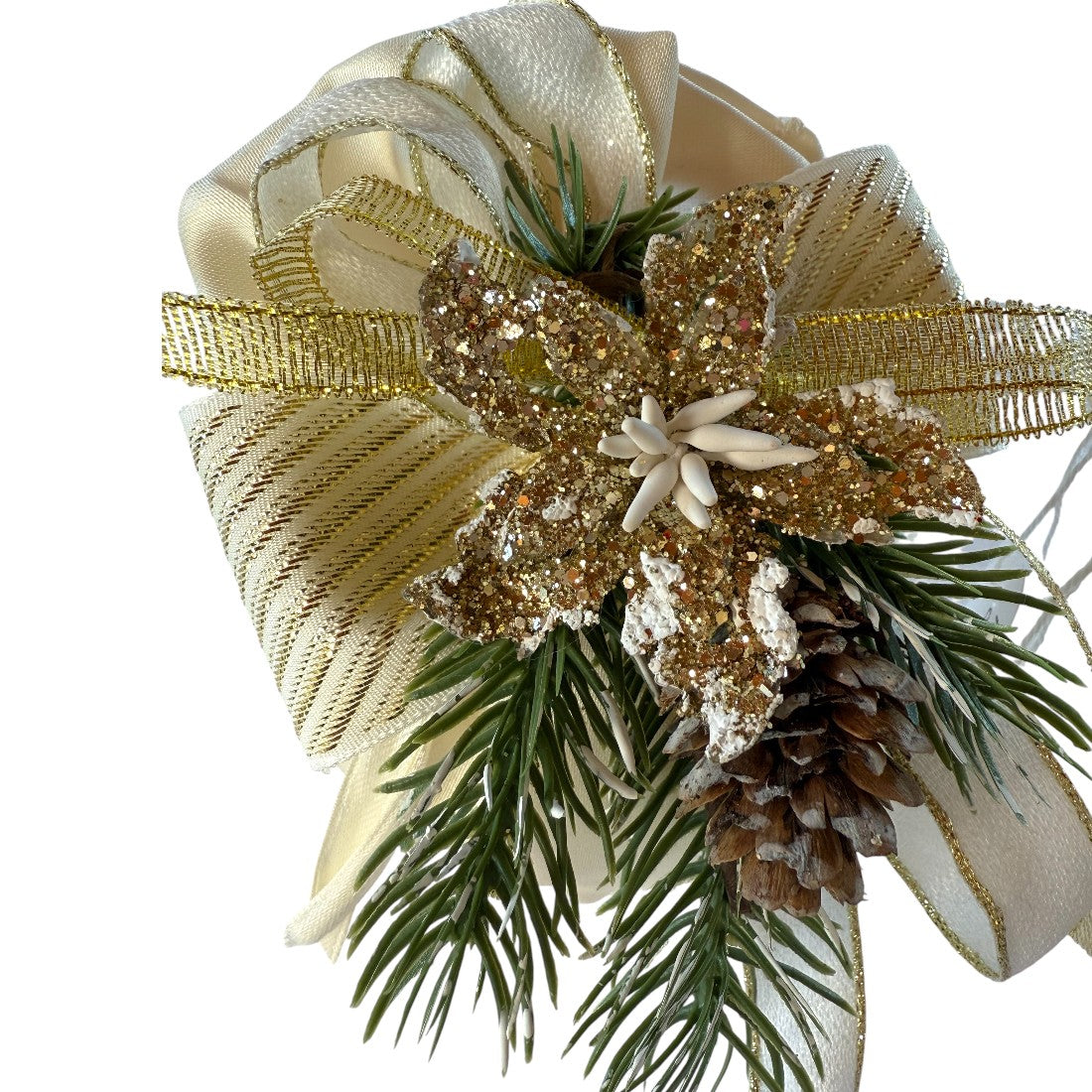 Bomboniera pouf con sacchetto in raso, decorata con doppio fiocco in velluto e arricchita da dettagli natalizi.