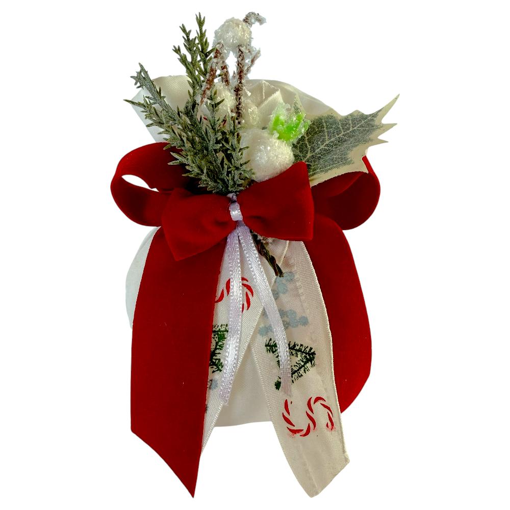 Bomboniera pouf con sacchetto in raso, decorata con doppio fiocco in velluto e arricchita da dettagli natalizi.