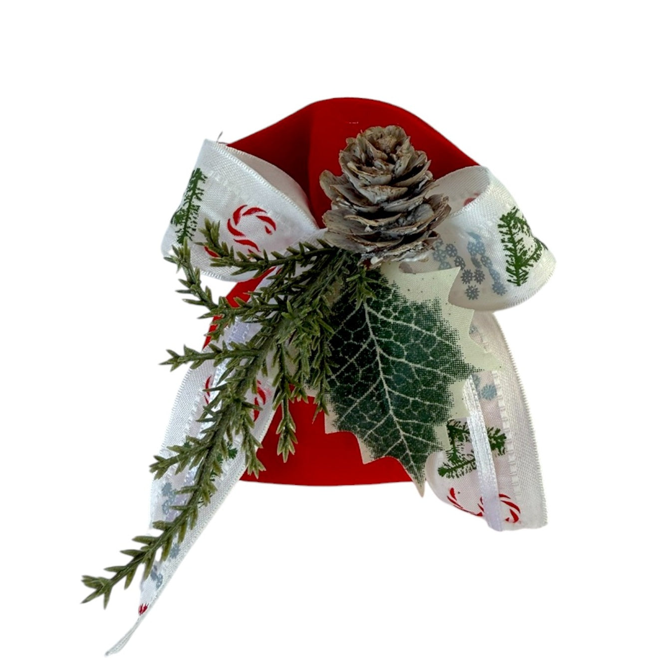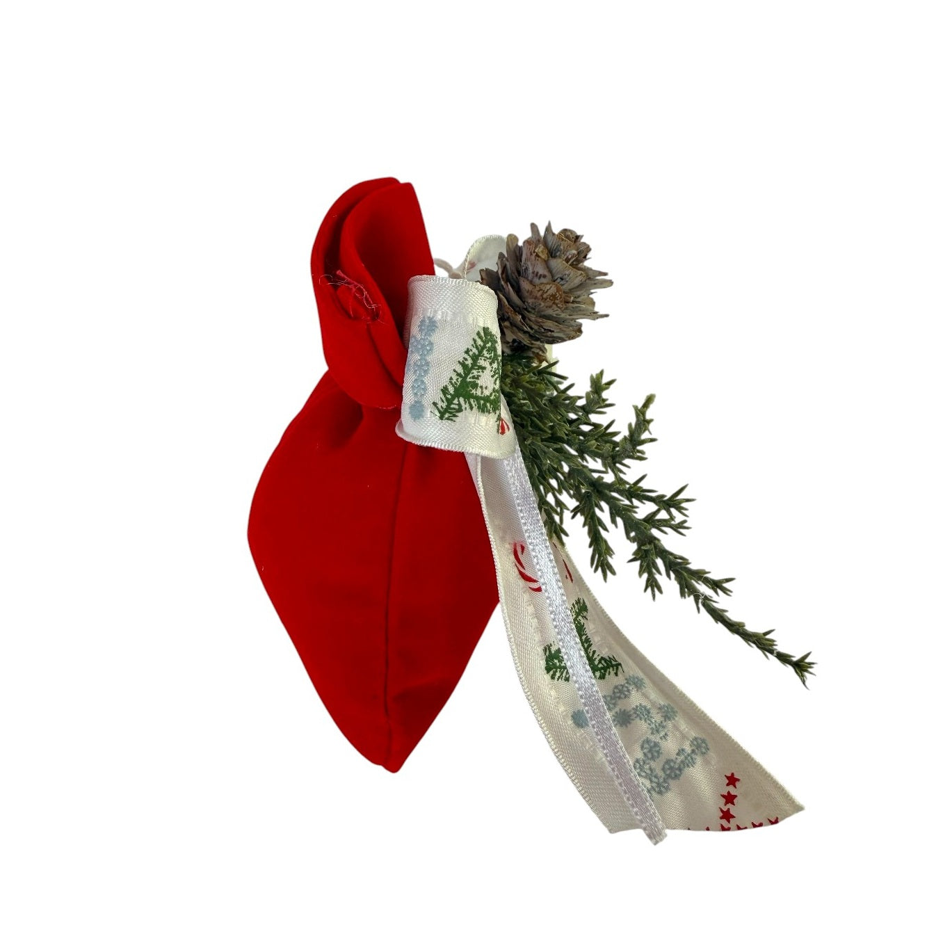 Bomboniera con sacchetto rosso, decorata con fiocco in tessuto e arricchita da dettagli natalizi.