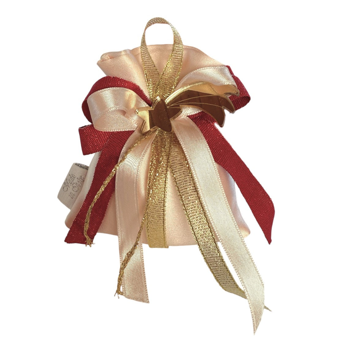 Bomboniera con sacchetto, decorata con doppio fiocco in raso e arricchita da una stella centrale in plexiglass.