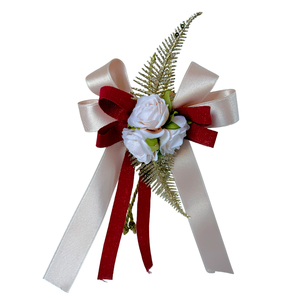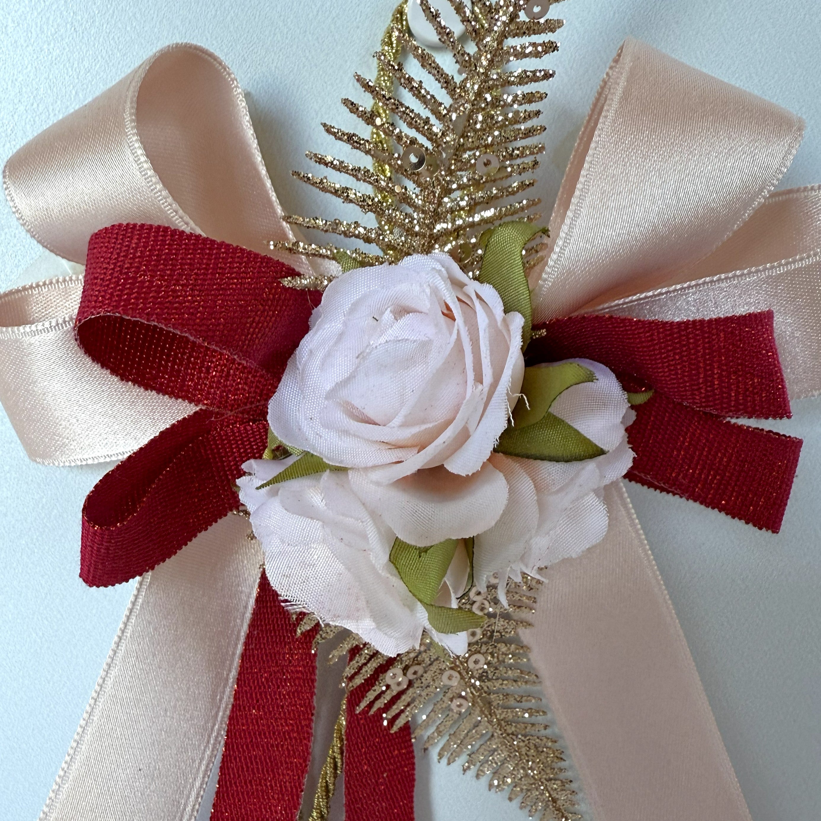 Segnaposto raffinato con doppio fiocco in raso, impreziosito da rose centrali, con delicati rametti decorativi.