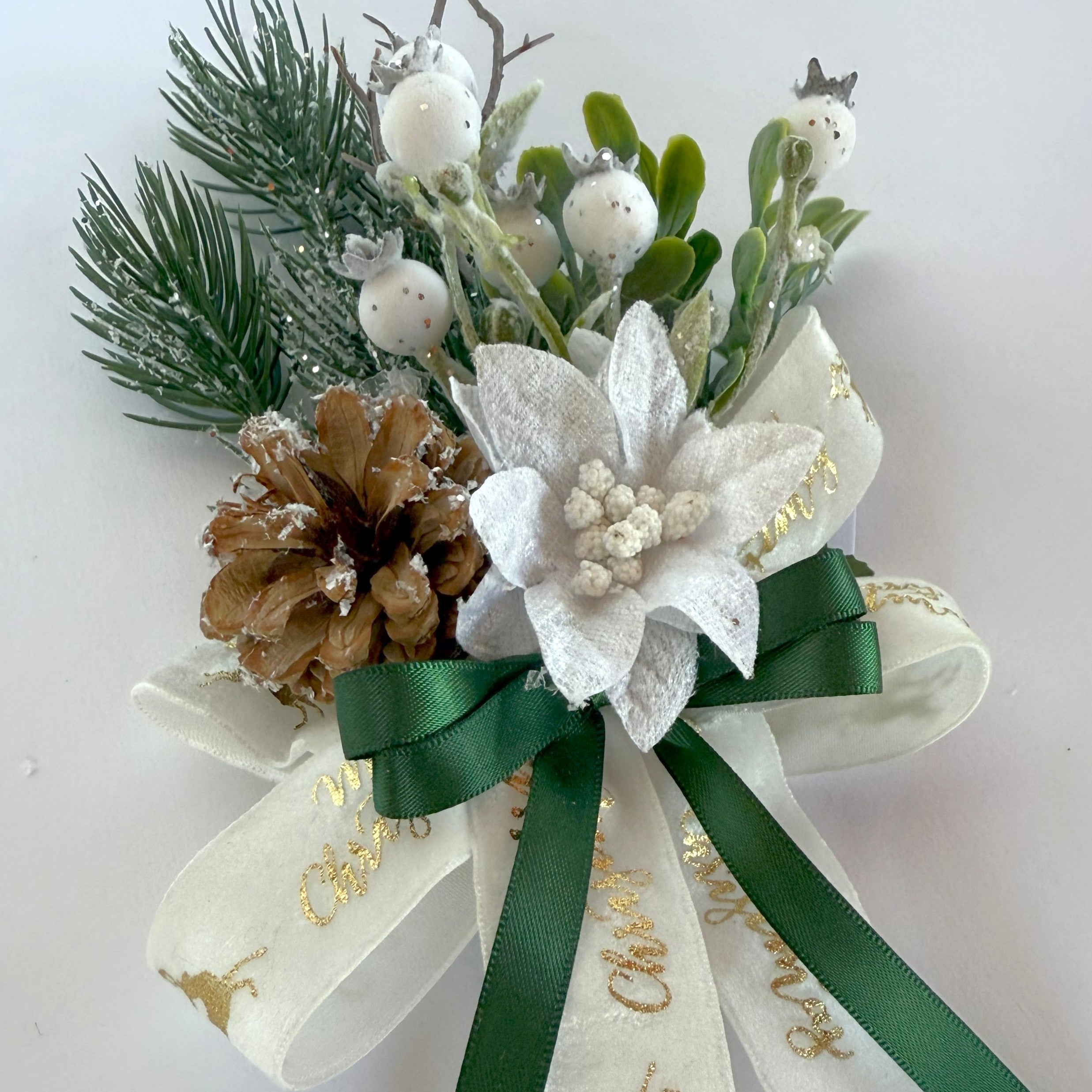 Segnaposto Stella di Natale, decorato con nastri bianchi e verdi e arricchito da pigne e rami di pino.