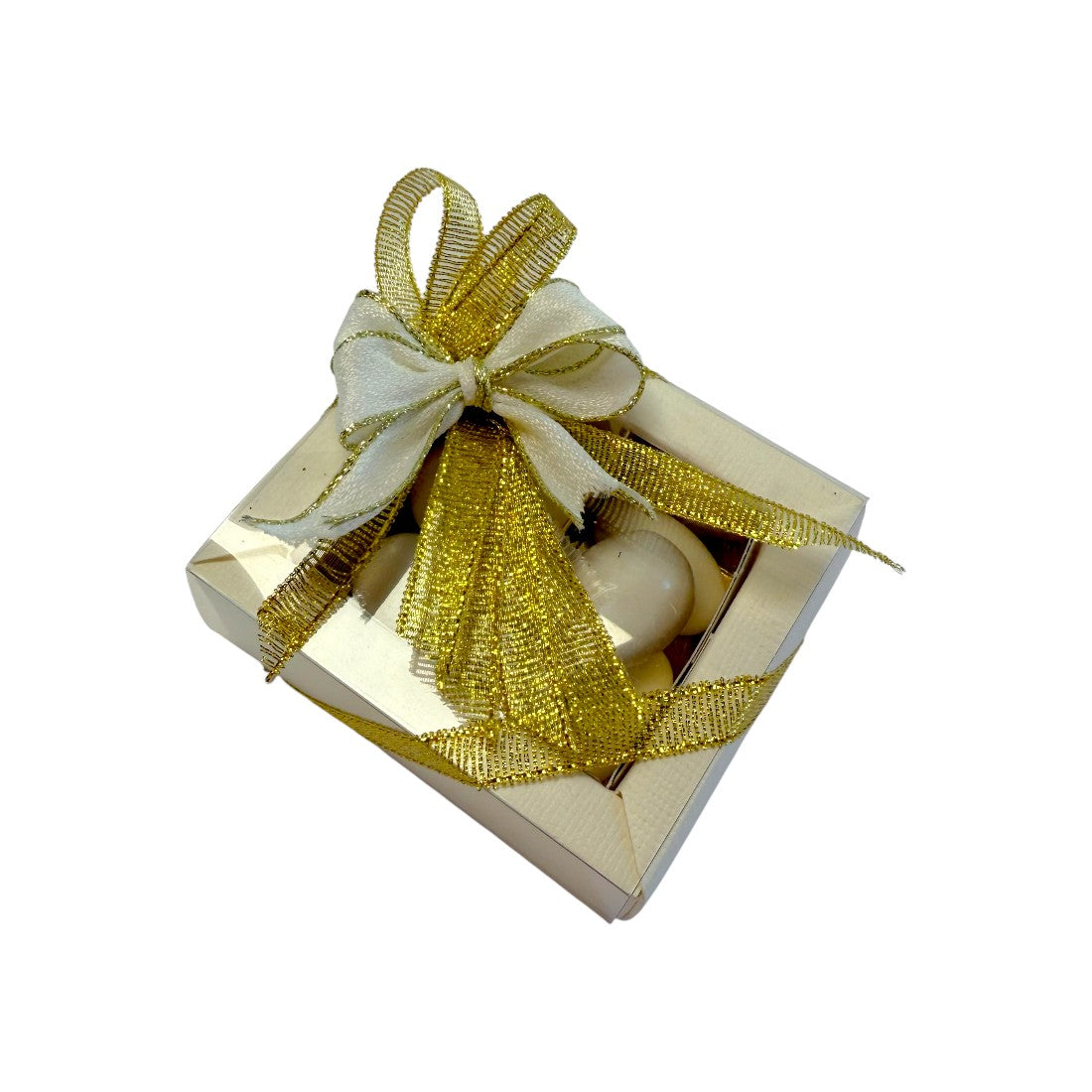 Box degustazione decorata con doppio fiocco in tessuto bianco e gold.
