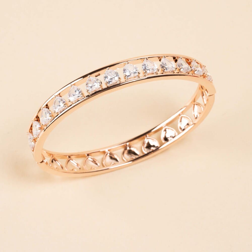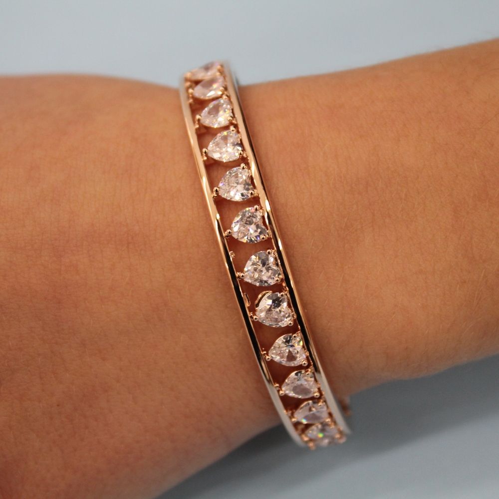 Bracciale rigido della collezione di David Jewels, realizzato in lega mettallica con finitura gold rose, impreziosito da una fila di zirconi bianchi taglio cuore.