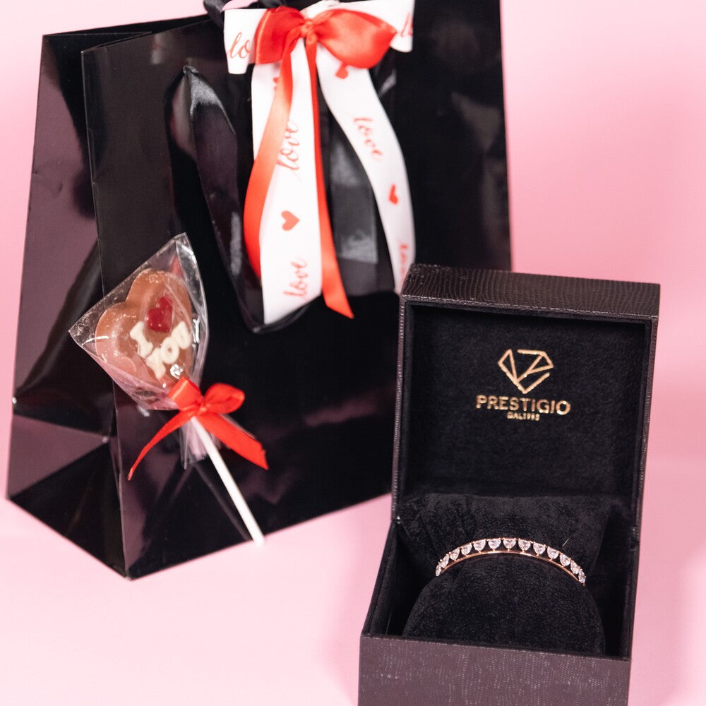 A completare il set troverai una Box, che conterrà il gioiello, un dolce lecca-lecca di cioccolato artigianale a forma di cuore con scritta “I Love You”, il tutto racchiuso in una raffinata shopper.