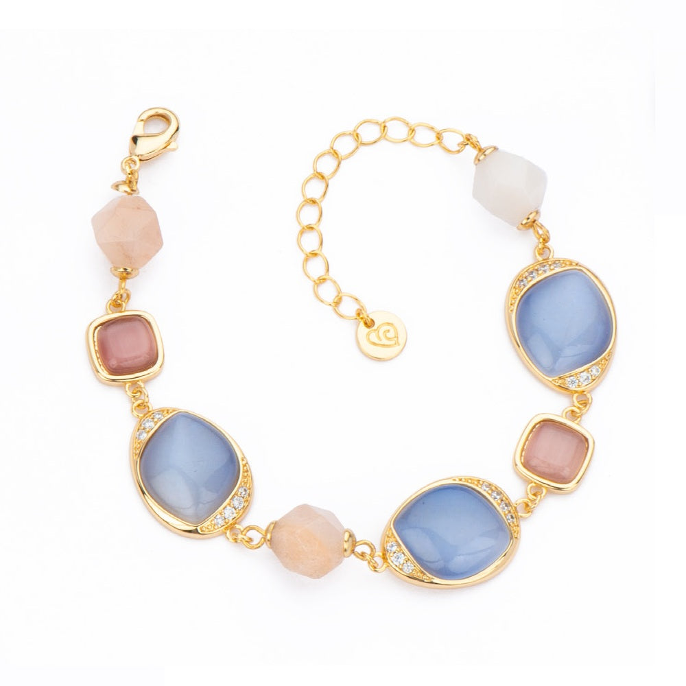 Bracciale Oblique della collezione "Contemporary Jewels Evolution" di Barbieri Creazioni, realizzato in ottone con finitura galvanica protettiva, impreziosito da eementi con intarsio obliquo in cat eye blu ceruleo e cipria, arricchiti da pietre in avventurina rosa.