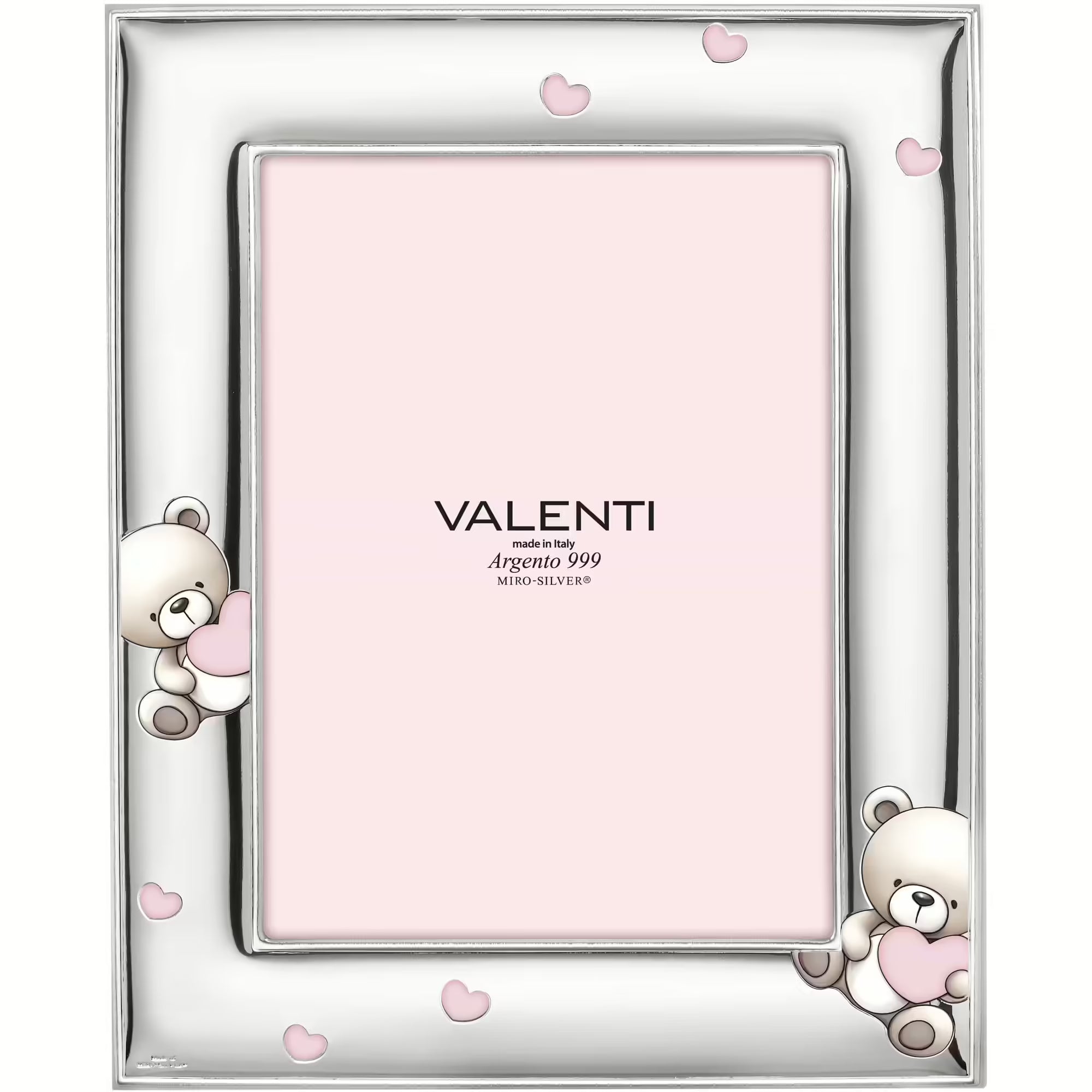 Cornice Portafoto Orsetto con Cuori della collezione baby di Valenti, realizzata in Argento Miro Silver, con dettagli in rilievo e retro in legno.