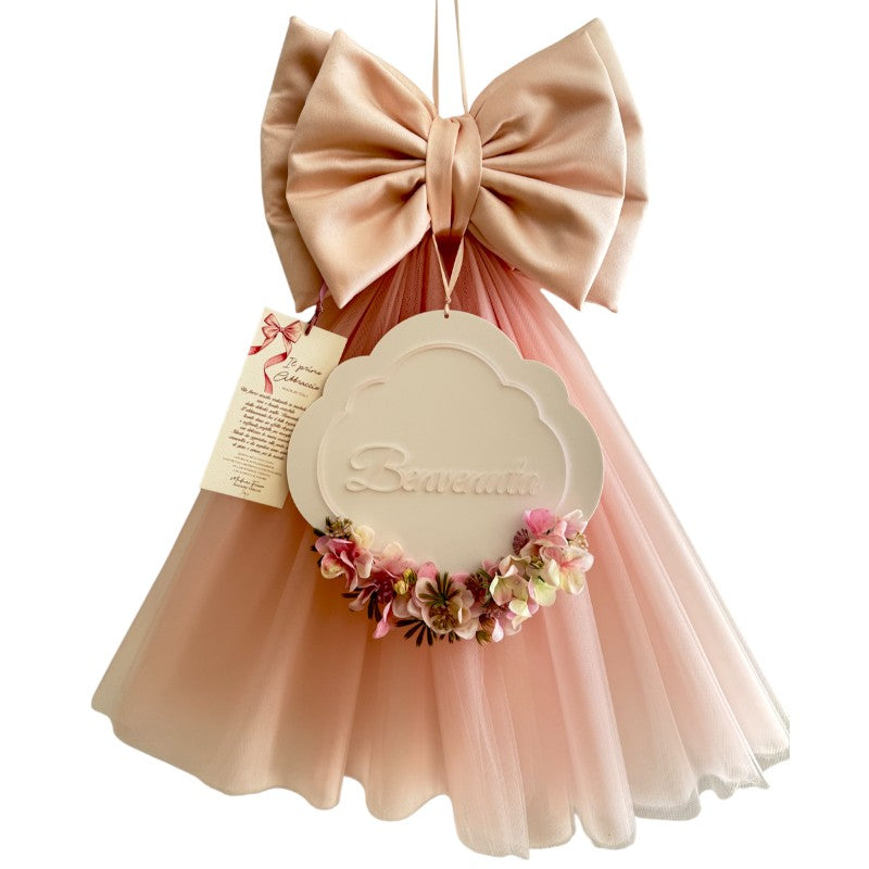 Fiocco Nascita "Il Primo Abbraccio" della collezione New Born Collection di Madame Fioccò, realizzato con fiocco in raso e elegante coda in tulle.