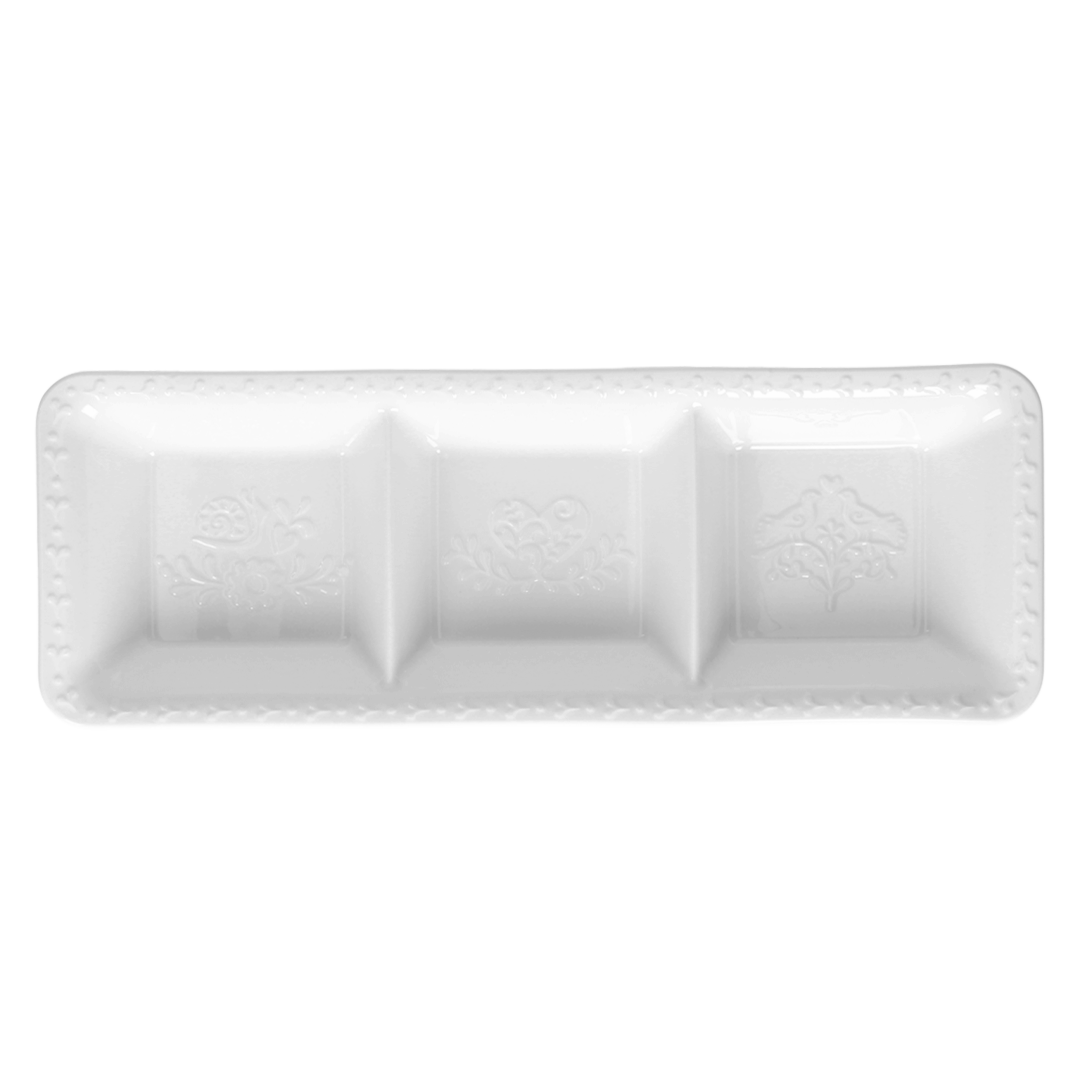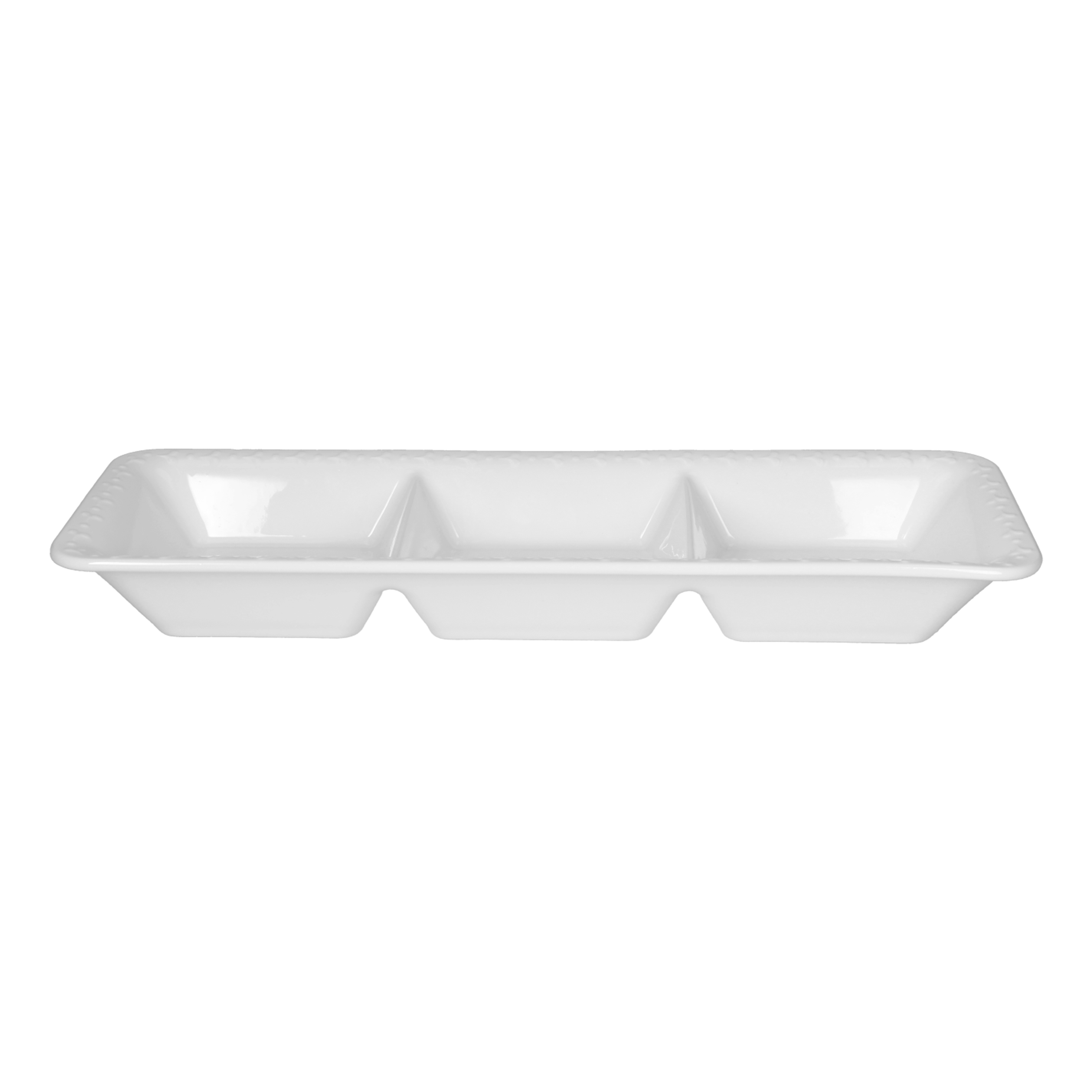 Piatto rettangolare a tre scomparti della collezione Etoile di Andrea Fontebasso, realizzato in porcellana new bone china con finish lucido.