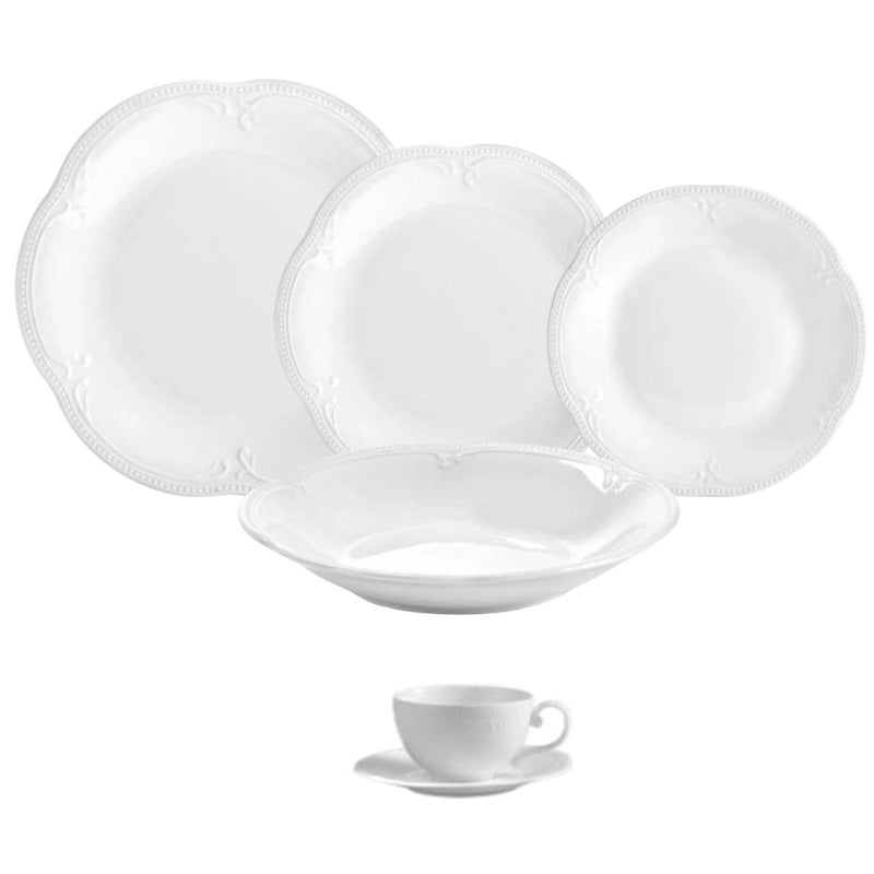 Il servizio è realizzato in porcellana bianca con decoro in rilievo ed è composto da: 12 piatti piani (cm. 26), 12 piatti fondi (cm. 23), 12 piatti frutta (cm. 20.5), 1 piatto da portata (cm. 30) e 12 tazzine caffè (ml.100).