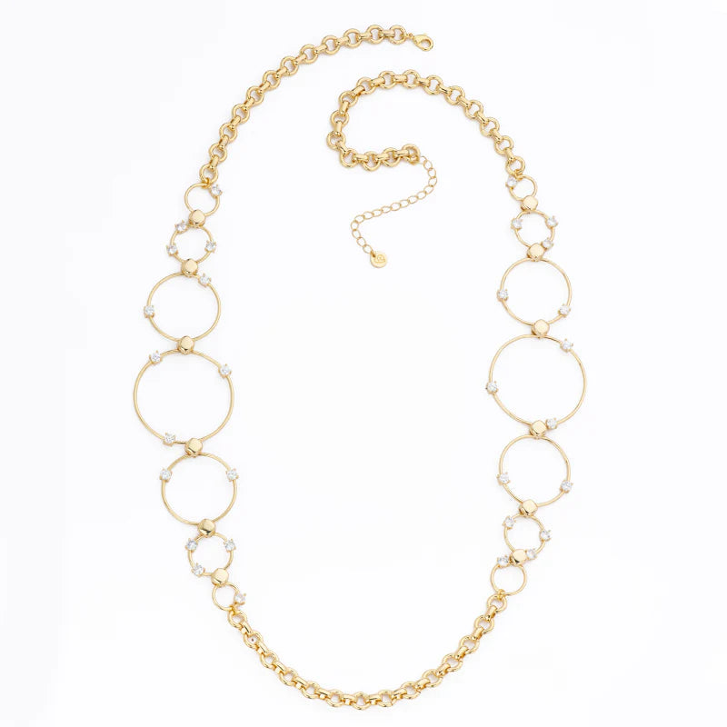 Collana della collezione "Contemporary Jewels Classy" di Barbieri Creazioni, realizzata in ottone con finitura galvanica protettiva, impreziosita da anelli multi-dimensione con zirconi bianchi.