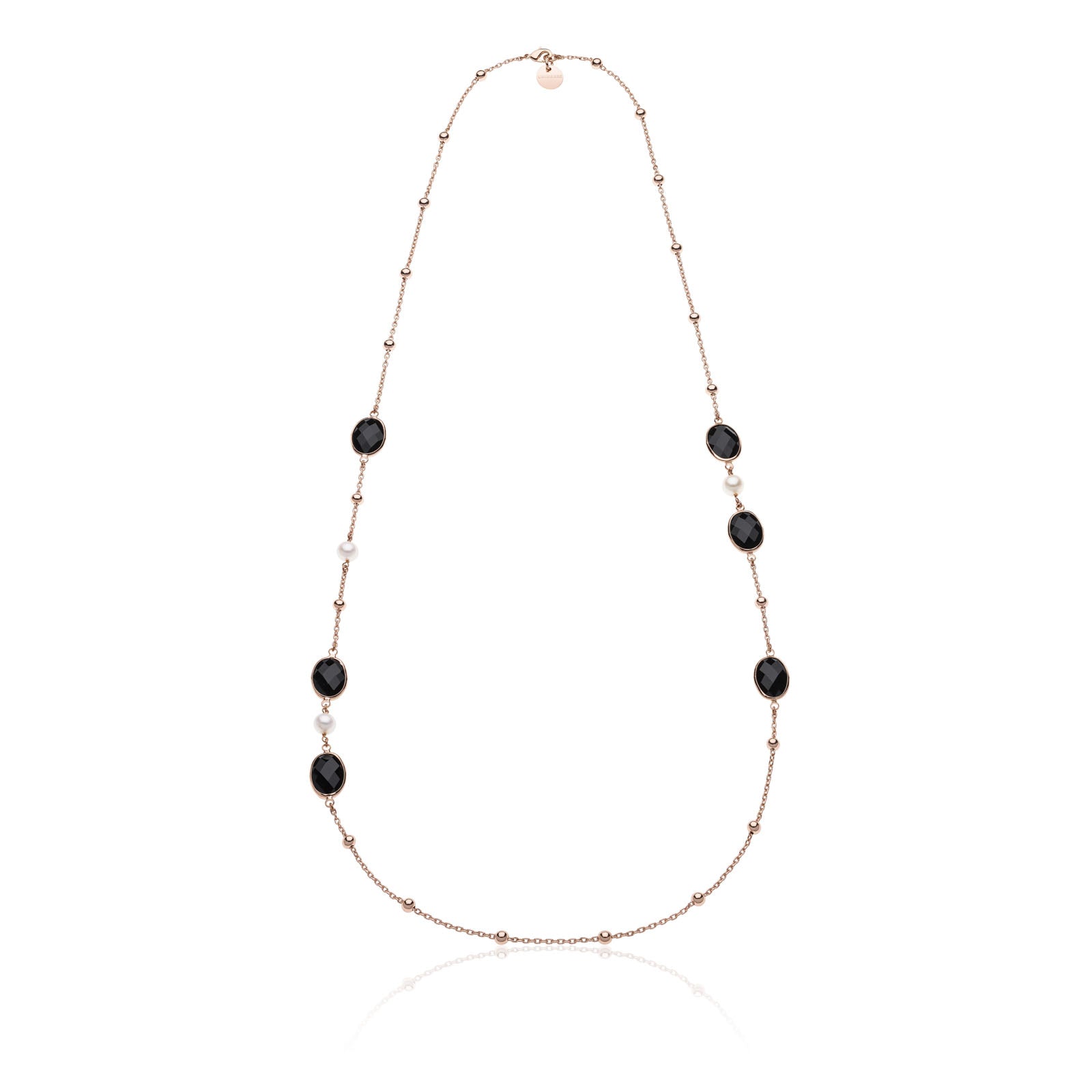 Collana chanel da donna della collezione "Jaipur" di Unoaerre, realizzata in bronzo impreziositi da bagno galvanico in Oro Rosa 24 kt., caratterizzata da una catena forzatina e impreziosita da perle e pietre nere.