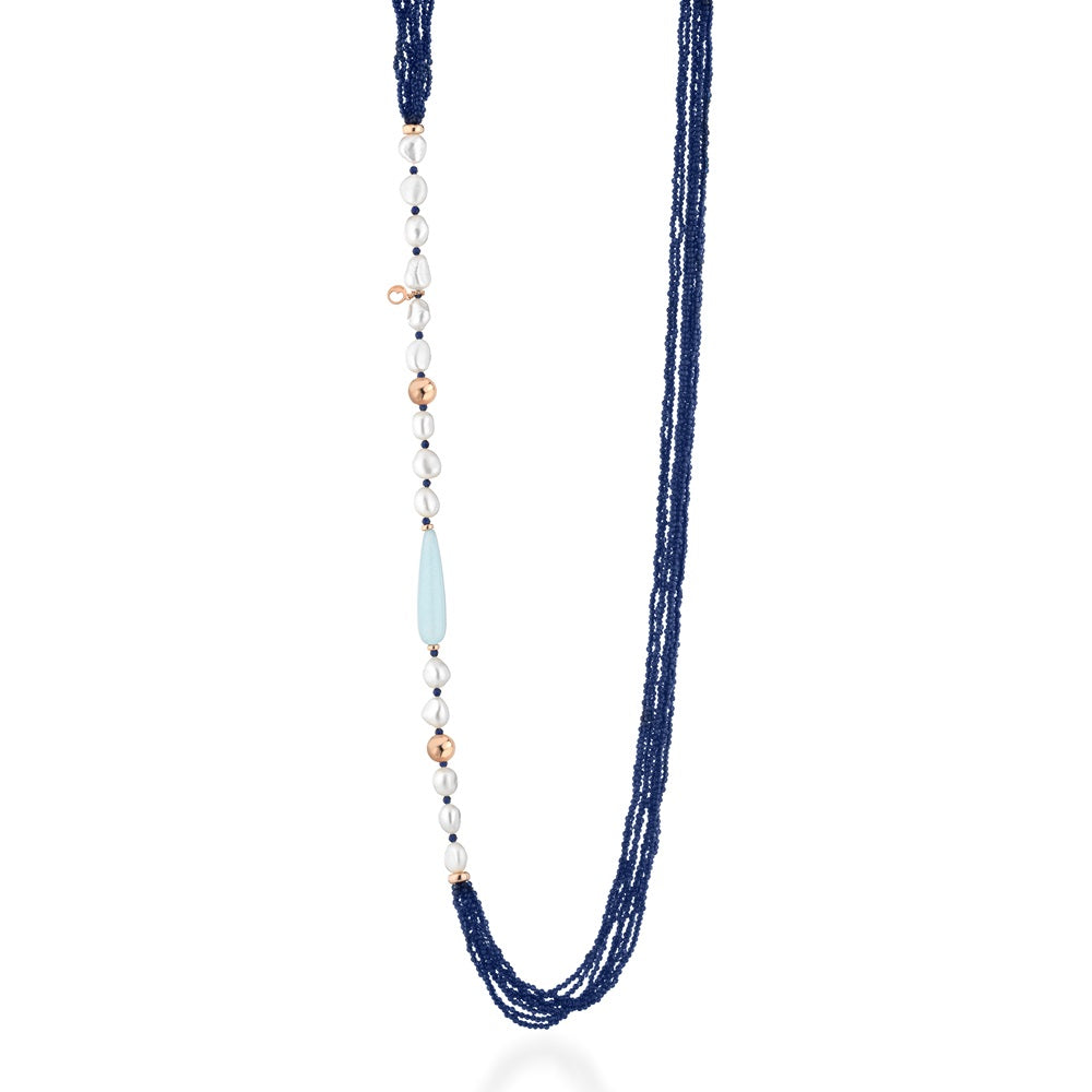 Collana della collezione "Glamour" di Lelune Gioielli, realizzata in argento 925% gold rose e impreziosita da perle d’acqua dolce, spinello blu e agata.