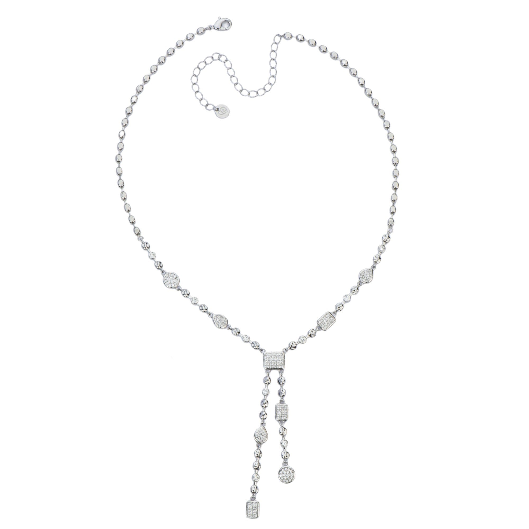 Collana Lumen a due fili della collezione "Contemporary Jewels Classy" di Barbieri Creazioni, realizzata in ottone con finitura galvanica protettiva, impreziosita da micro elementi rettangolari, a goccia e rotondi impreziositi da pavé di zirconi chiari.