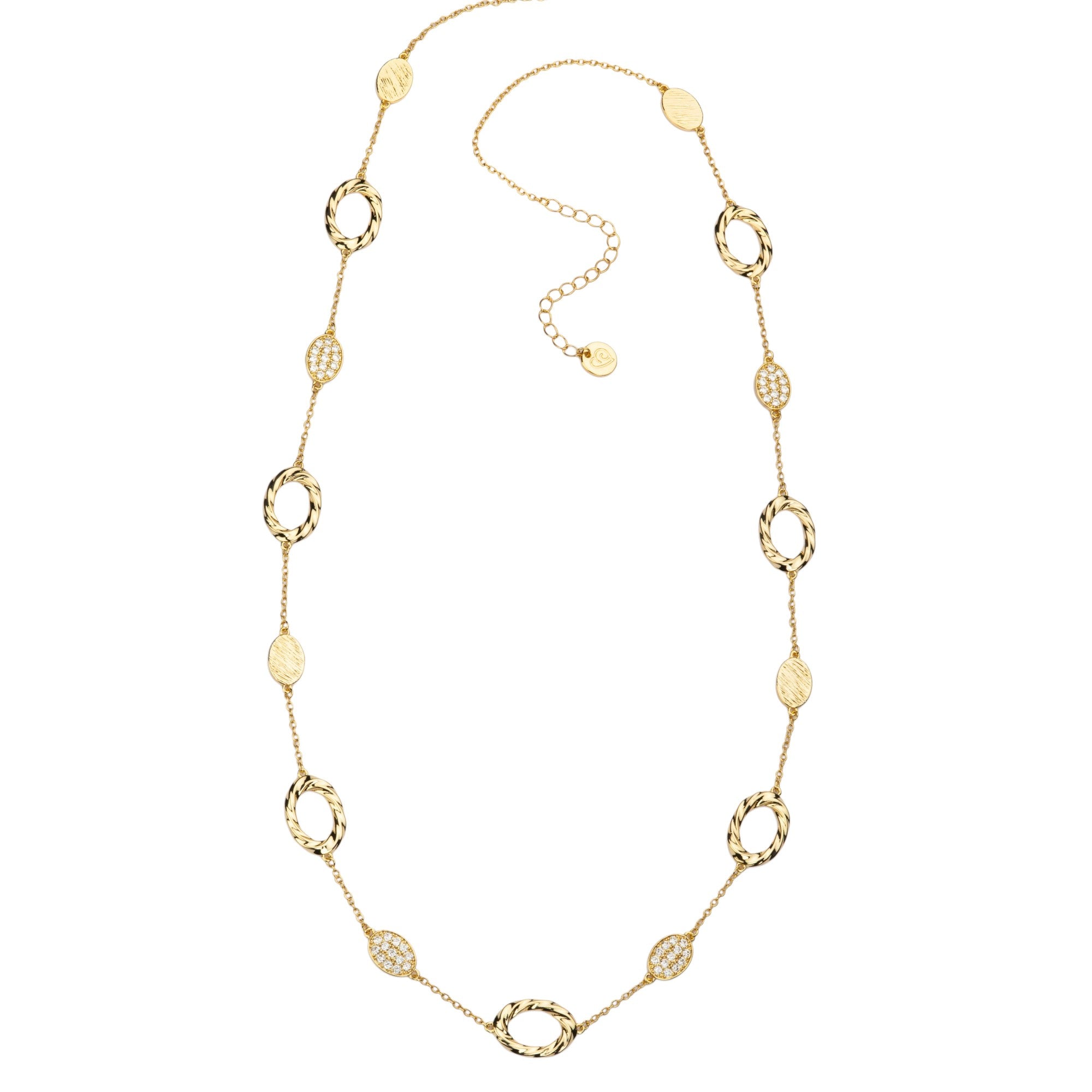 Collana Pavè Torchon della collezione "Contemporary Jewels Classy" di Barbieri Creazioni, realizzata in ottone con finitura galvanica protettiva, impreziosita da anelli torchon ovali, con pavè di zirconi bianchi.