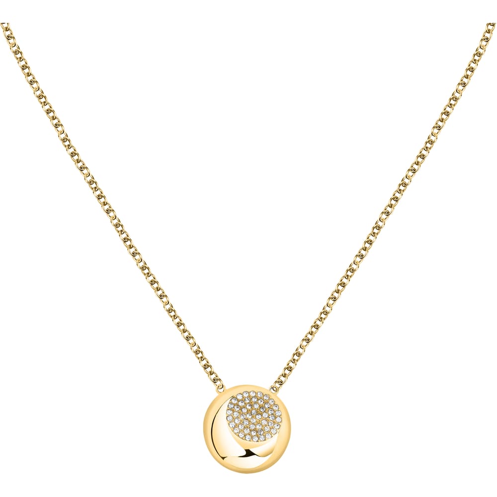 Collana donna della collezione T-Design di Trussardi, realizzata in acciaio anallergico con finitura gold, impreziosita da zirconi bianchi centrali.