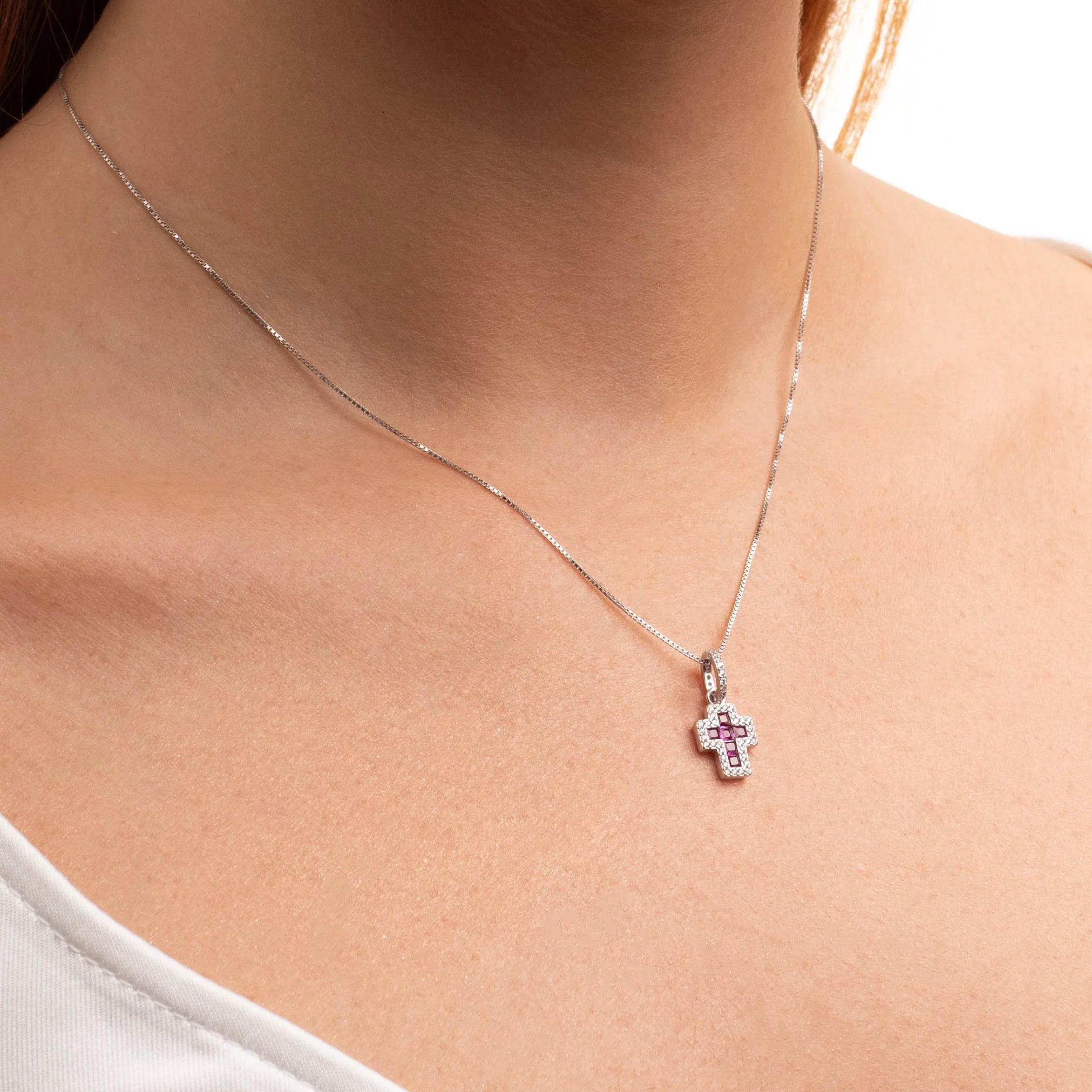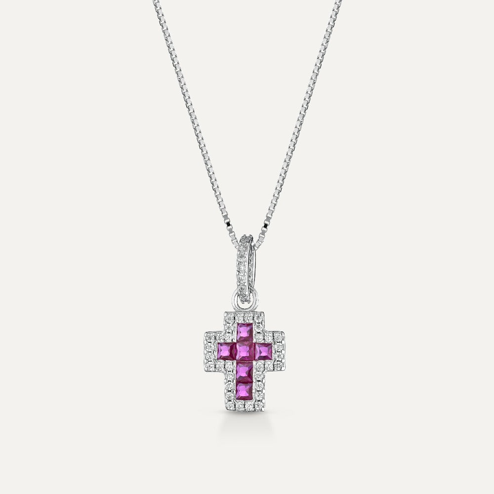 Collana realizzata in Argento 925% rodiata in Oro Giallo 18 kt. con croce pendente impreziosita da zirconi di colore fucsia e bianco taglio square.
